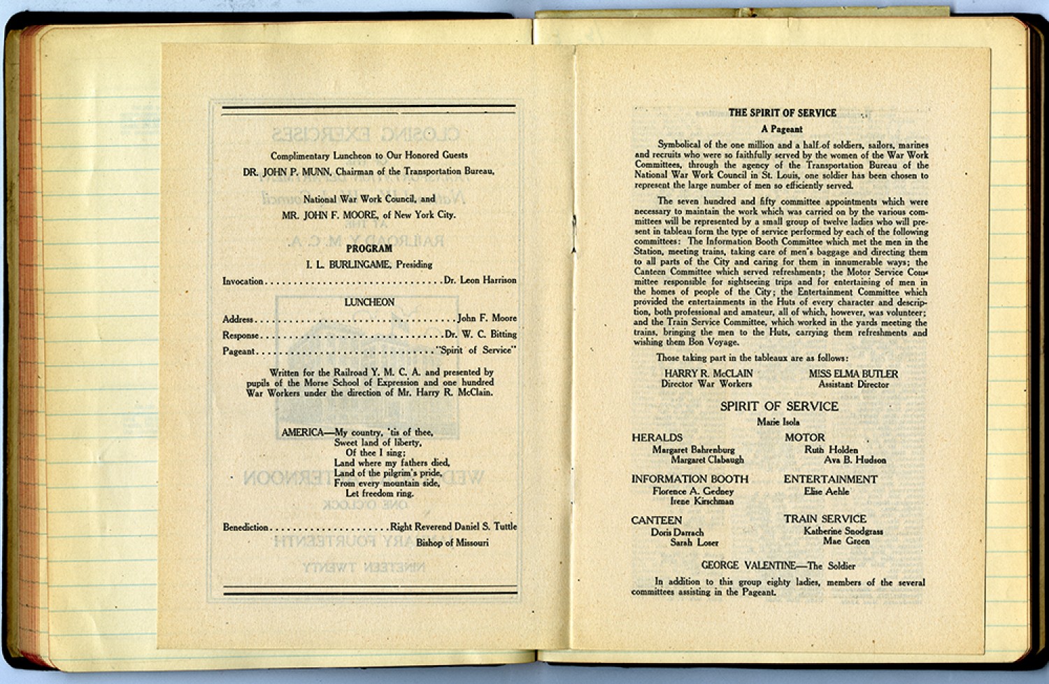 [program] Complimentary Luncheon to Our Honored Guests DR. JOHN P. MUNN, Chairman of the Transportation Bureau, National War Work Council, and MR. JOHN F. MOORE, of New York City. PROGRAM I. L. BURLINGAME, Presiding Invocation.....Dr. Leon Harrison LUNCHEON Address.....John F. Moore Response.....Dr. W.C. Bitting Pageant.....”Spirit of Service” Written for the Railroad Y.M.C.A. and presented by pupils of the Morse School of Expression and one hundred War Workers under the direction of Mr. Harry R. McClain. AMERICA – My country, “tis of thee, Sweet land of liberty, Of thee I sing; Land where my fathers died, Land of the pilgrim’s pride, from every mountain side, Let freedom ring. Benediction.....Right Reverend Daniel S. Tuttle Bishop of Missouri THE SPIRIT OF SERVICE A Pageant Symbolical of the million and a half soldiers, sailors, marines and recruits who were so faithfully served by the women of the War Work Committees, through the agency of the Transportation Bureau of the National War Work Council in St. Louis, one soldier has been chosen to represent the large number of men so efficiently served. The seven hundred and fifty committee appointments which were necessary to maintain the work which was carried on by the various committees will be represented by a small group of twelve ladies who will present tableau from the type of service performed by each of the following committees: The Information Booth Committee which met the men in the Station, meeting trains, taking care of men’s baggage and directing them to all parts of the City and caring for them in innumerable ways; the Canteen Committee which served refreshments; the Motor Service Committee responsible for sightseeing trips and for entertaining of men in the homes of people of the City; the Entertainment Committee which provided the entertainments in the Huts of every character and description, both professional and amateur, all of which, however, was volunteer; and the Train Service Committee, which worked in the yards meeting the trains, bringing the men to the Huts, carrying them refreshments and wishing them Bon Voyage. Those Taking part in the tableaux as follows: HARRY R. McCLAIN Director War Workers MISS ELMA BUTLER Assistant Director SPIRIT OF SERVICE Maria Isola HERALDS Margaret Clabaugh MOTOR Ruth Holden Ava B. Hudson INFORMATION BOOTH Florence A. Gedney Irene Kirschman ENTERTAINMNET Elise Aehle CANTEEN Doris Darrach Sarah Loser TRAIN SERVICE Katherine Snodgrass Mae Green GEORGE VALENTINE – The Soldier In addition to this group eighty ladies, members of the several committees assisting in the Pageant
