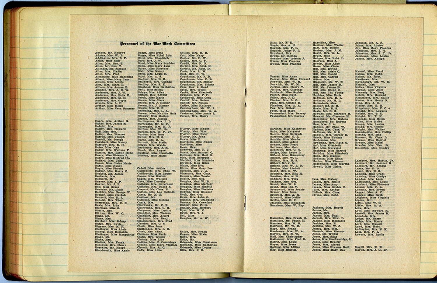 [program] Personnel of the War Work Committees Abeken, Mr. Rodowe Adams, Mrs. W. B,. Assington, Mrs. D. F. Aehle, Miss Elise Allen, Mrs. Geo. T. Allen, Mr. Geo T. Allender, Mr. Samuel Allen, Mrs. Fred Alexander, Miss Marceline Albert, Miss Mary Jane Allison, Miss Linnie Aloe, Mrs. Clara B. Allison, Mrs. James E. Amsden, Mrs. J.B.W. Anderson, Mrs. J.W. Anderson, Mrs. Felix E. Anderson, Mrs.M.D. Anderson, Mrs. Gayle Arends, Mrs. A. P. Arthur, Miss Helen Arthur, Miss Vera Sommer Baare, Mrs. Arthur G. Baker, Mrs. James E. Babbitt, Mrs. Bailey, Mrs. Howard Ball, Mrs. Geo Bailey, Mrs. Warren Barroll, Mrs. Joseph Barnhart, Miss Nancy Barstow, Mrs. E.H. Bates, Miss Olga Baker, Mrs. Wallace F. Bassler, Mrs. Lottie Irene Barry, Miss Eloenor J. Barry, Miss Mildred Ida Ballard, Mrs. John Bacon, Miss Claire Marie Bates, Miss Nancy Bayle, Miss Pjoebe Barker, Mrs. Harry C. Beckette, Mr.James Beckerle, Mrs. Beckerle, Mr. Beaver, Mrs. J.P. Beaver, Mr. J.P. Bell, Miss Grace Benecke, Mr. Louis Beckley, Mrs. George W. Becker, Miss Huldah, Bennett, Mrs. E.J. Benoist, Mrs. Theo Berryman, Mrs. D. C. Beis, Mrs. Lida Bierman, Miss G. Biddle, Mrs. Bitting, Mrs. W.C. Binns, Mr. Binns, Mrs. Birchett, Mrs. Sidney Biggs, Mrs, Mrs. Davis Bigger, Mrs. M. H. Biebinger, Miss Marquerite Blake, Mr. Blake, Mrs. Blelock, Mrs. Frank Boeckler, Mrs. Henry Boeckler, Mr. Henry Bloodworth, Miss Annie Boggs, Miss Irma Boggs, Miss Ethel Lois Boyd, Mrs. J. W. bond, Miss Mary Scudder Bolin, Miss Mary Jane Boyer, Miss Florence Blair, Miss Nancy Boyd, Mrs. Louis B. Boyd Mrs. A.S. Bradley Brashear, Miss Katherine Brell, Miss Selma Briggs, Mrs. Allan Britain, Rev. Arthur Brock, Miss Marie Brown, Miss Clara, Browm Mrs. J. Homer Brown, Mrs. E.F. Browning, Mrs. L.A. Brown, Miss Matilda Galt Brokaw, Miss Marian Bryson, Mrs. Joseph Burlingame, Mrs. I.L. Burroughs, Mr. M.P. Burroughs, Mrs. M.P. Burden, Mrs. W., Sr. Burden, Mrs. W.F., Jr. Burden, Miss Bess Butler, Mrs. H.S. Burns, Mrs. R.A. Burnett, Miss Stella Briggs, Mrs. Walso Broderick, Mrs. J.K. Busch, Mrs. August Bunting, Miss Henrietta Blosson, Miss Marie Cabell, Mrs. Ashley Caillonette, Mrs. Chas. W. Caillonette, Miss Louise Capen, Miss Marion Capen, Mrs. Wallace Cave, Miss Dorothy Calhoun, Mrs. Governeur Calhoun, Mrs. Davic R. Caspari, Mr. Chas. E. Carton, Mrs. Leo Desmet Casey, Mr. M.B. Cartiser, Mr. Carleton, Miss Dorcas Caulk, Mrs. Chervenka, Mr. C.R. Chervenka, Mrs. C.R. Chapman, Mrs.Benj. Champberlin, Mrs. Fred Chesbro, Mrs. C.S. Clark, Miss June Chittenden, Mrs. L. E. Clark, Mrs. Chas. Clark, Mrs. Wilson Christy, Miss Lide Collins, Mrs. C. Cummings Collins, Miss Mary Viginia Church, Miss Alice Collins, Mrs. H.B. Colm, Miss Mary Conley, Mr. P.W. Cooley, Mrs. C. F. Condit, Mrs. F.G. Corlett, Mrs. Robt. D. Corlett, Mr. Rebt. D. Coste, Mrs. L.W. Cost, Mrs. L.W. Cost, Mrs. H.W. Couchman, Mr. F.B. Couchman, Mrs. F.B. Couchman, Mr. Sidney Couchman, Mrs. Sidney Coxe, Rev. J. Boyd Creel, Mrs. Wylie Crabb, Miss Elizabeth Crunden, Mrs. F.B. Crockwell, Miss Cora Cunliff, Mrs. Nelson Curlee, Miss Kathryn Cunningham, Mr. W.A. Cunningham, Mrs. W.A. Culver, Mrs. Harry D’Arcy, Miss Maude D’Arcy, Mrs. Wm. D’Arcy, Mrs. Wm. D’Arcy Miss Ruby D’Arcy, Mr. John Davis, Miss C. Davidson, Miss Dean, Mrs. Dan, Mrs. Denyven, Mrs. R.J. Davis, Mrs. Samuel C. Delmore, Mrs. Karl G. Dick, Miss Gertrude Dietrich, Miss Montelle Dietrich, Miss Ellen Dixon, Miss Eva Dixon, Miss Mary Lee Dickson, Mrs. J.A. Dinsmore, Mrs. Chas. Demsky, Miss Tessie Dobler, Mrs. Geo. Douglas, Miss Marjory Douglas, Miss Ninette Douglas, Miss Beatrice Dobny,Miss Eleanor Dock, Mrs. Geo. Drew, Mrs. John G. Duncan, Mrs. Crawford Crawford, Mr. Dudley, Mrs. F.G. Dunlay, Mrs. Herbert Dyer, Mrs. H. C. Drew, Mrs. T.J. Dell, Miss Douglas, Mr. A.W. Eaton, Mrs. Frank Eagon, Miss Elvia Eddy, Mrs. Eddy, Mr. Edwards, Miss Constance Edwards, Miss Katherine Edwards, Miss Louise Ellis, Mrs. F.E. Ellis, Mr. E.E. Engle, Mrs. A.N. English, Mrs. F.L. English Judge F.L. Erquhart, Mrs. Erwin, Dr. Bertha Eskeles, Mrs. Adrian J. Evens, Miss Frances Ewens, Miss Frances Farrar, Miss Anne Farrar, Mrs. Eliza Howard Fenwick, Mrs. W. M. Fenwick, Mr. W. M. Ferriss, Mrs. Henry T. Fielder, Mrs. Clarence Fishback, Miss Sophie Fisher, Miss Ruth Filley, Mrs. J.D. Fischer, Mrs. L.c. Fisk, Mrs. Clinton H. Flanders, Mrs. A.A. Fox, Mrs. Gilbert, Frost, Miss Mary Frauenthal, Mrs. Barney Frauenthal, Mr. Barney Gardner, Miss Karherine Gade, Miss Margaret Garvin, Miss Gertrude Garrison, Mrs. O.L. Gamble, Miss Maude, Gehner, Miss Adele Gehner, Miss Pearl Gellhirn, Mrs. Geo. Generelly, Mrs. G.T. Gettys, Mrs. Laura L. Gifford, Mrs. Humphrey Gilliam, Mrs. W.L. Gilliam, Mrs. H.S. Gilbert, Mrs. J.M. Gifford, Mrs. W.L.R. Gordon, Mrs. Lindell Gould, Mrs. G.W. Goodrich, Mrs. Ella H. Goodbar, Mrs. A.B. Goddard, Mrs. Tyra Graham, Mrs. Tyra Graham, Mrs. Geo. Grant, Mrs. W.S. Grant, Miss Ida V. Greenwood, Miss Jennie Gruner, Miss Irma Griswold, Miss Nellie Griffin, Mrs. E. P. Grayson, Miss Elizabeth Gunnison, Mrs. W. Roy Hamilton, Mrs. Frank H. Hamilton, Mr. Frank H. Harrison, Mrs. W.B. Harrison, Mr. W.B. Hays, Mrs. Frank Hardaway, Mrs. W. A. Harvery, Mrs. E.W. Hall, Mrs. Christopher, Hattersley, Mrs. Fred R. Harris, Mrs. Louis Hayes, Miss Irene Harting, Miss Lillian Hay, Miss Minetta Hazeltine, Miss Harting, Mrs. Walter Hart, Mrs. Bessie Herbert, Mrs. J.M. Heath, Mrs. W.L. Heuer, Miss Hedges, Mrs. Robt. L. Hearvery, Miss A. Hewitt Miss Alice Hesse, Miss Clara Hill, Mrs. Ewing Hill, Mrs, Adele C. Hill, Mrs. Daniel Hill Mrs. Carroll Hilton, Mrs. Hippisley, Mr. W.E. Hill, Mr. James B. Hill, Mrs. Glenn C. Hill, Mrs. Ida Young Hopkins, Miss Doris Hoffman, Mrs. H. L. Hoffamn, Mr. H.L. Hollenbeck, Mrs. Hooper, Mr. E.H. Hoxie, Mrs. R.S. Hoxie Mr. R. S. Howard, Mrs. Clarence H. Howard, Mr. Clarence H. Humphrey,Mrs. Rubens, Humphrey, Dr. Rubens How, Mrs. C. A. Hudson, Mr. Chas. W. Hudson, Mrs. Chas W. Huffman, Mr. S.S. Hubbell, Mrs. Garner E. Hurck, miss Thelma Holderness, Mrs. Hyndman, Mrs. Ruth