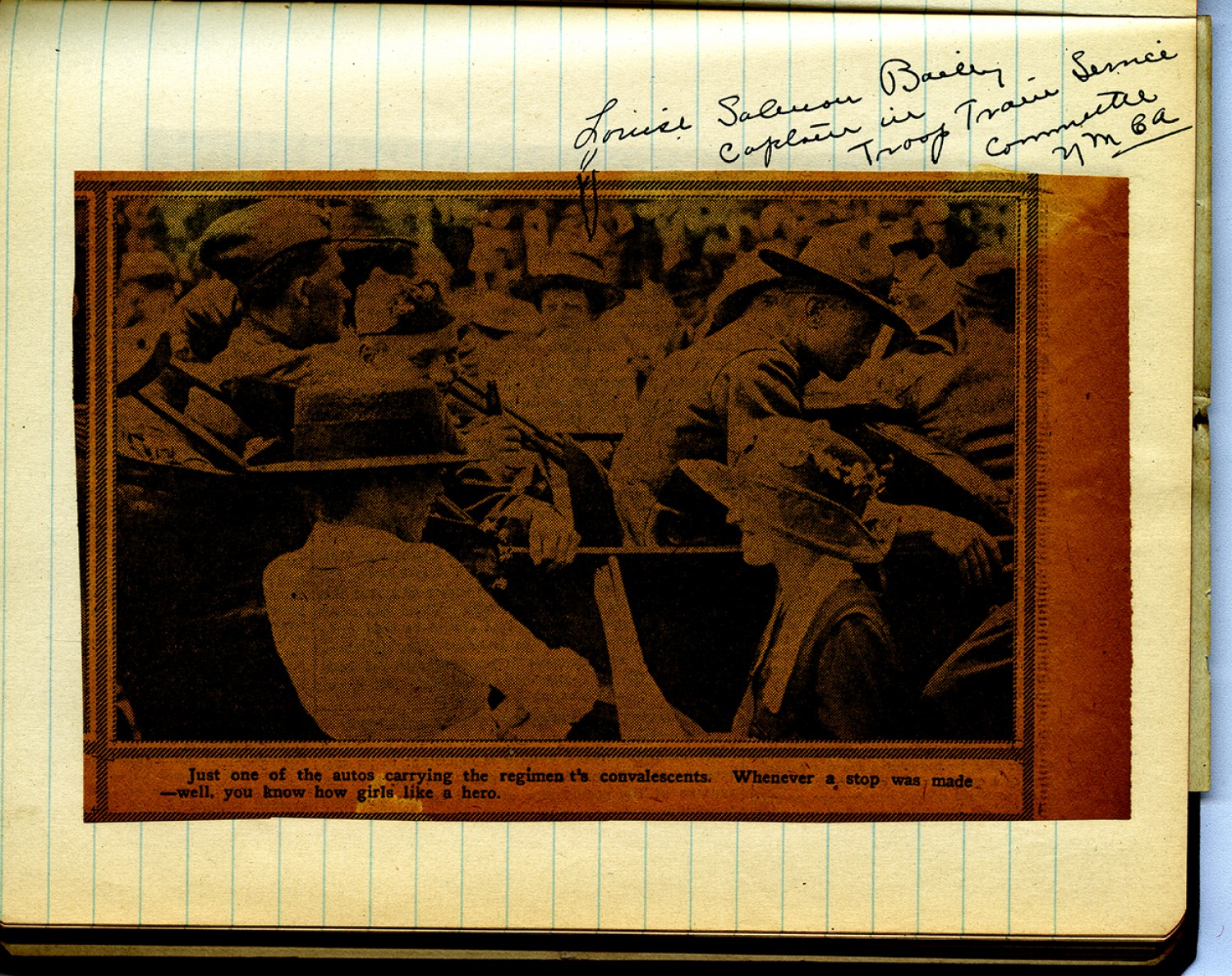[photograph] Louise Salmon Bailey Captain in Troop Train Service Committee YMCA Just one of the autos carrying the regiments convalescents. Whenever a stop was made - well. you know how girls like a hero.