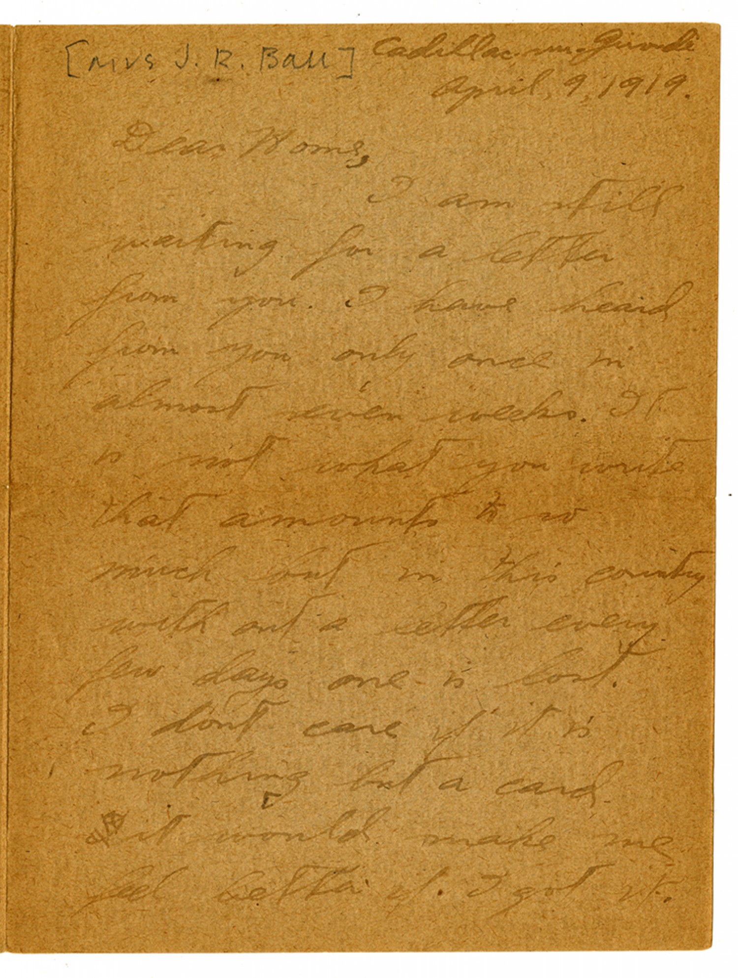 Cadillac - sur - Garonne April 9, 1919. Dear Home, I am still waiting for a letter from you. I have heard from you only once in almost seven weeks. It is not what you write that amounts to so much but in this country with out a letter every few days one is lost. I dont care if it is nothing but a card. It would make me feel better if I got it.