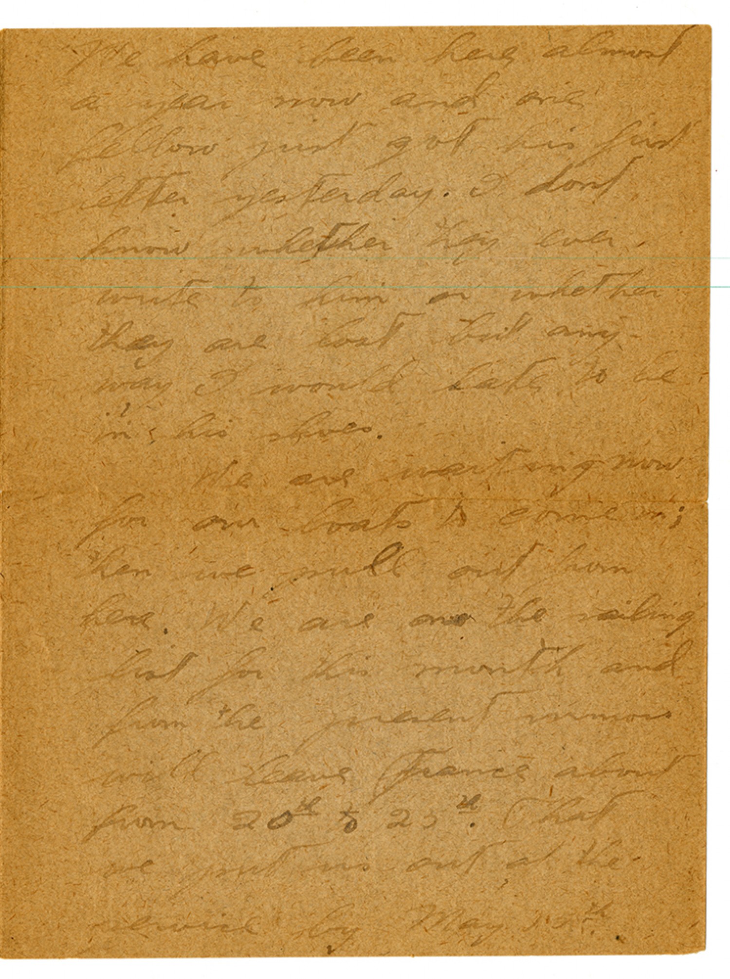 We do not have to do any parading after we reach the states. I may have to go to [ms illegible: 1 wd] before I come home but I will get there just the same. If you do not here from me now for some time just guess that I am on the ocean. I will send a telegram as soon as possible after reaching that side. Do not stop writing because you can never tell what is going to happen. I will get your letters some time. There is one thing that I have not told you of before about two or three