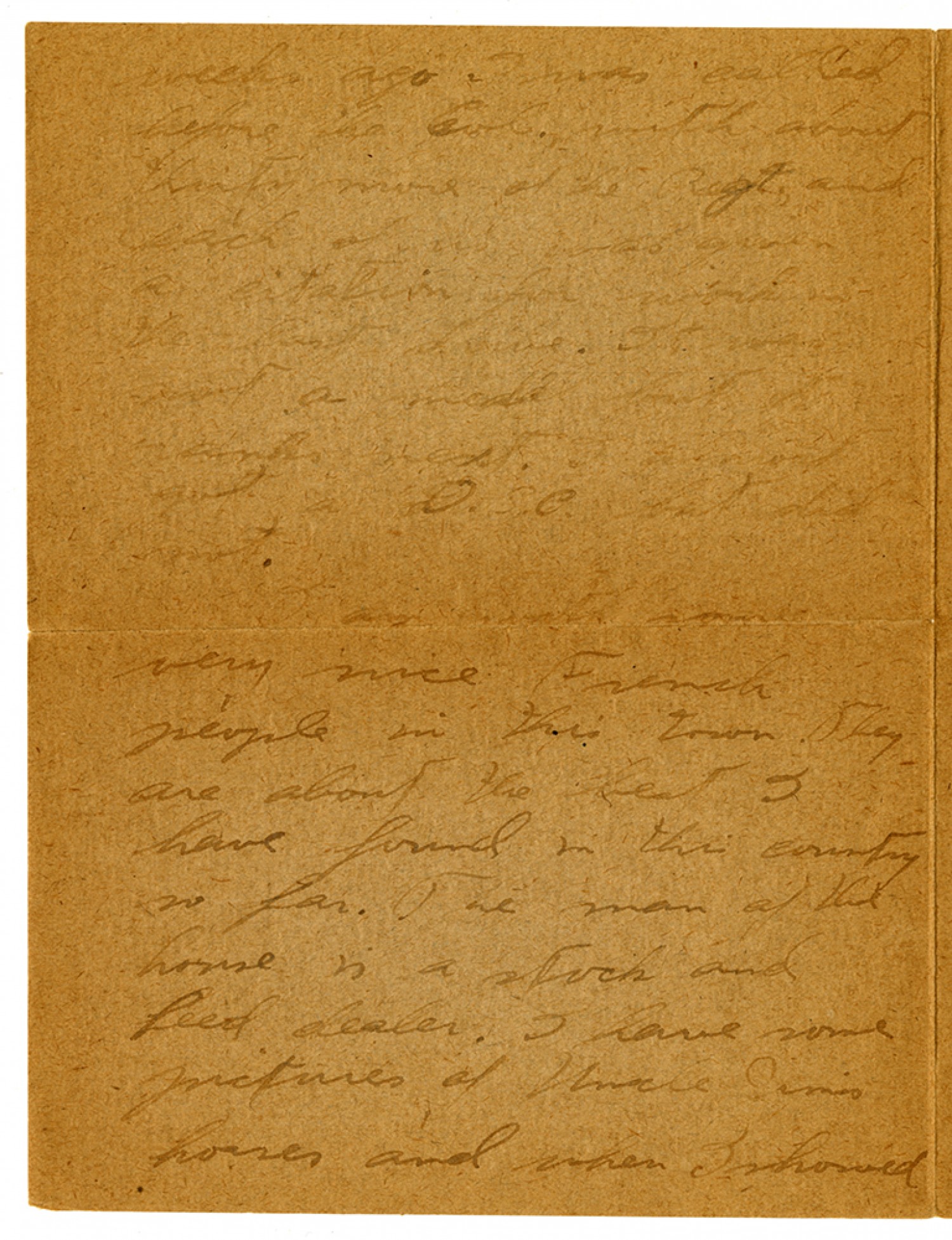 weeks ago I was called before the Col. with about thirty more of the Regt. and each of us was given a citation for [ms illegible: 1 wd] in the last drive. It was not a medal but it ranks next. I [ms illegible: 1 wd] got a D.S.C. but did not. I am with some very nice French people in this town. They are about the best I have found in this country so far. The man at the house is a stock and feed dealer. I have some pictures of Uncle Sam's horses and when I showed