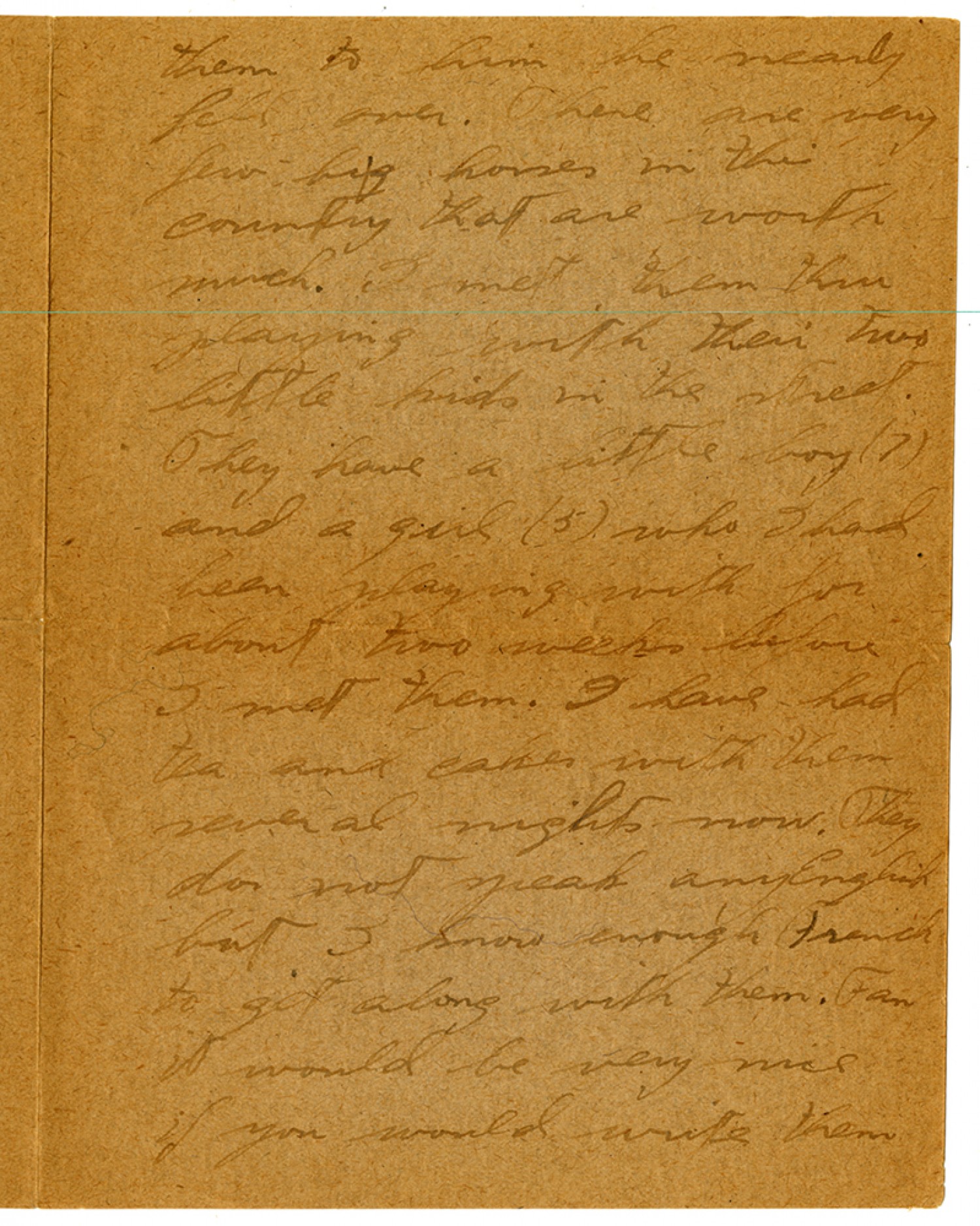 them to him he nearly fell over. There are very few big horses in this country that are worth much. I met them thru playing with their two little kids in the street. They have a little boy (7) and a girl (5) who I had been playing with for about two weeks before I met them. I have had tea and cakes with them several nights now. They do not speak any English but I know enough French to get along with them. Fan it would be very nice if you would write them