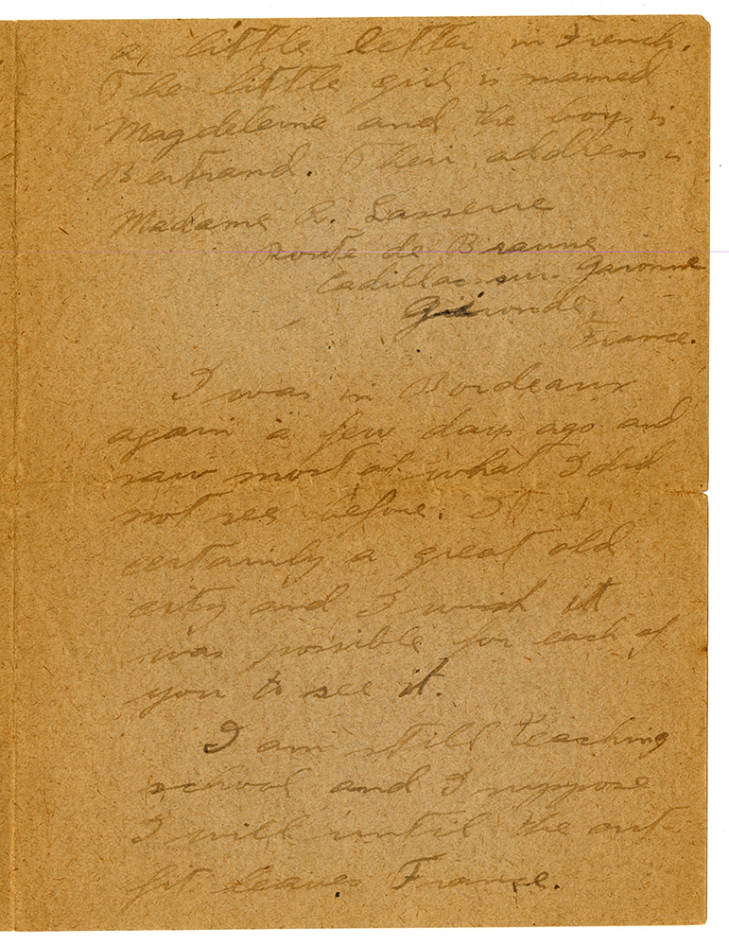 a little letter in French. The little girl is named Magadeleine and the boy is Bertrand. Their address is Madame R. Lassenne. Route de Braune Cadillac - sur - Garonne Gironde, France. I was in Bordeaux again a few days ago and saw most of what I did not see before. It is certainly a great old city and I wish it was possible for each of you to see it. I am still teaching school and I suppose I will until the outfit leaves France.
