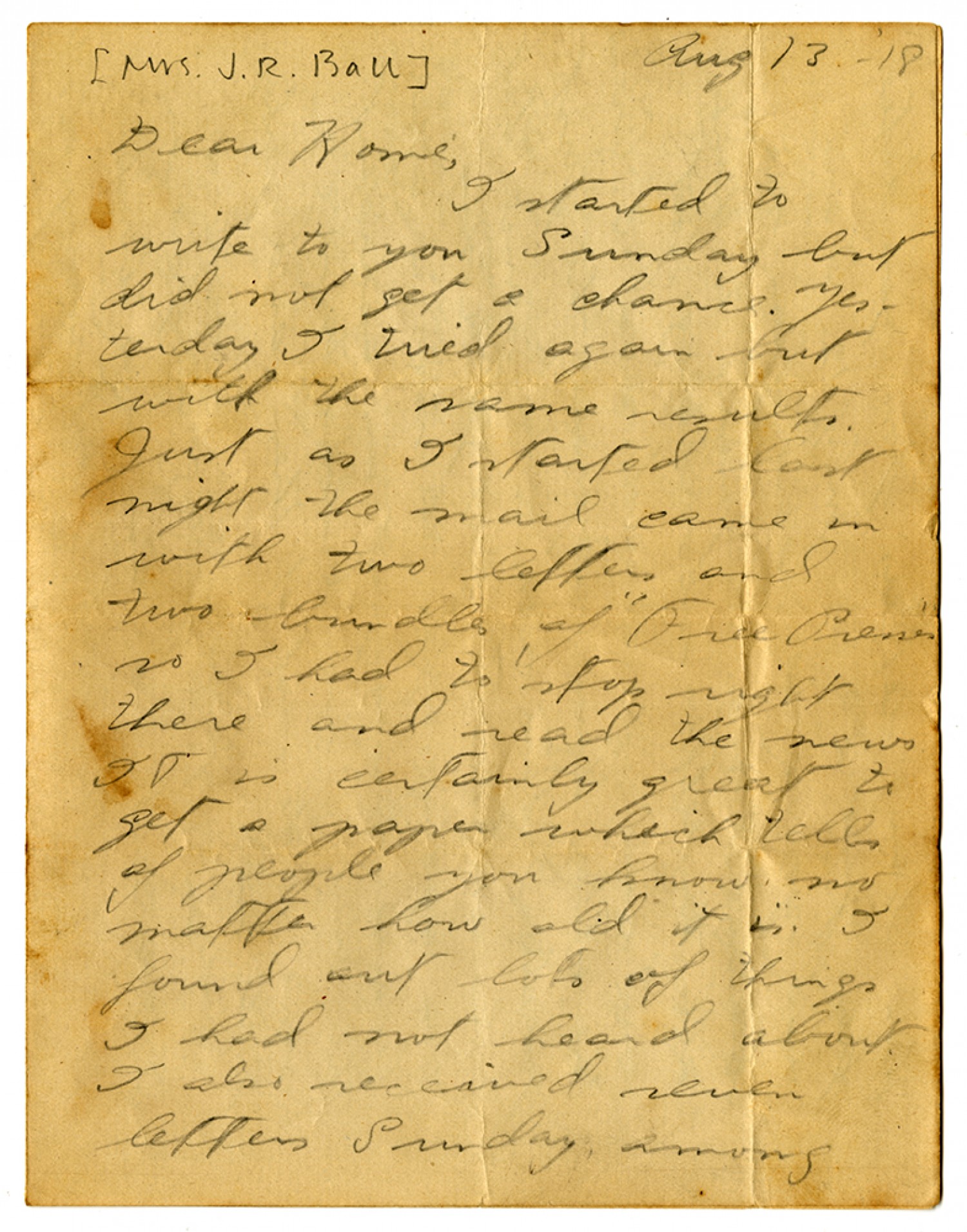 [August 13, 1918] Dear Home, I started to write to you Sunday but did not get a chance. Yesterday I tried again but with the same results. Just as I started last night the mail came in with two letters and two bundles of "Free Press" so I had to stop right there and read the news It is certainly great to get a paper which tells of people you know no matter how old it is. I found out lots of things I had not heard about I also received seven letters Sunday among