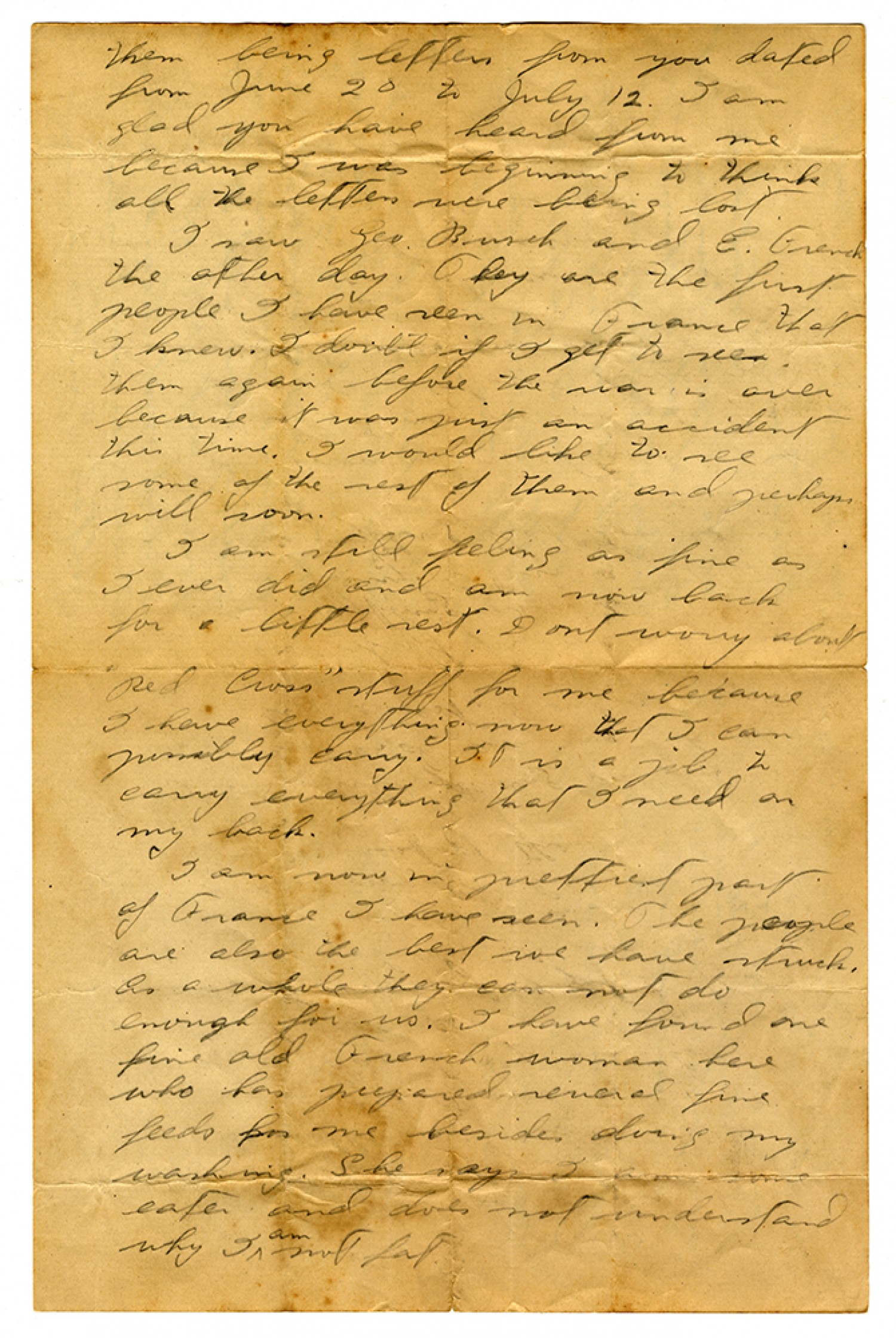 them being letters from you dated from June 20 to July 12. I am glad you have heard from me because I was beginning to think all the letters were being lost. I saw Geo. Busch and E. French the other day. They are the first people I have seen in France that I knew. I doubt if I get to see them again before the war is over because it was just an accident this time. I would like to see some of the rest of them and perhaps will soon. I am still feeling as fine as I ever did and am now back for a little rest. Dont worry about "Red Cross" stuff for me because I have everything now that I can possibly carry. It is a job to carry everything I need on my back. I am now in prettiest part of France I have seen. The people are also the best we have struck. As a whole they can not do enough for us. I have found one fine old French woman here who has prepared several fine feeds for me besides doing my washing. She says I am some eater and does not understand why I am not fat.