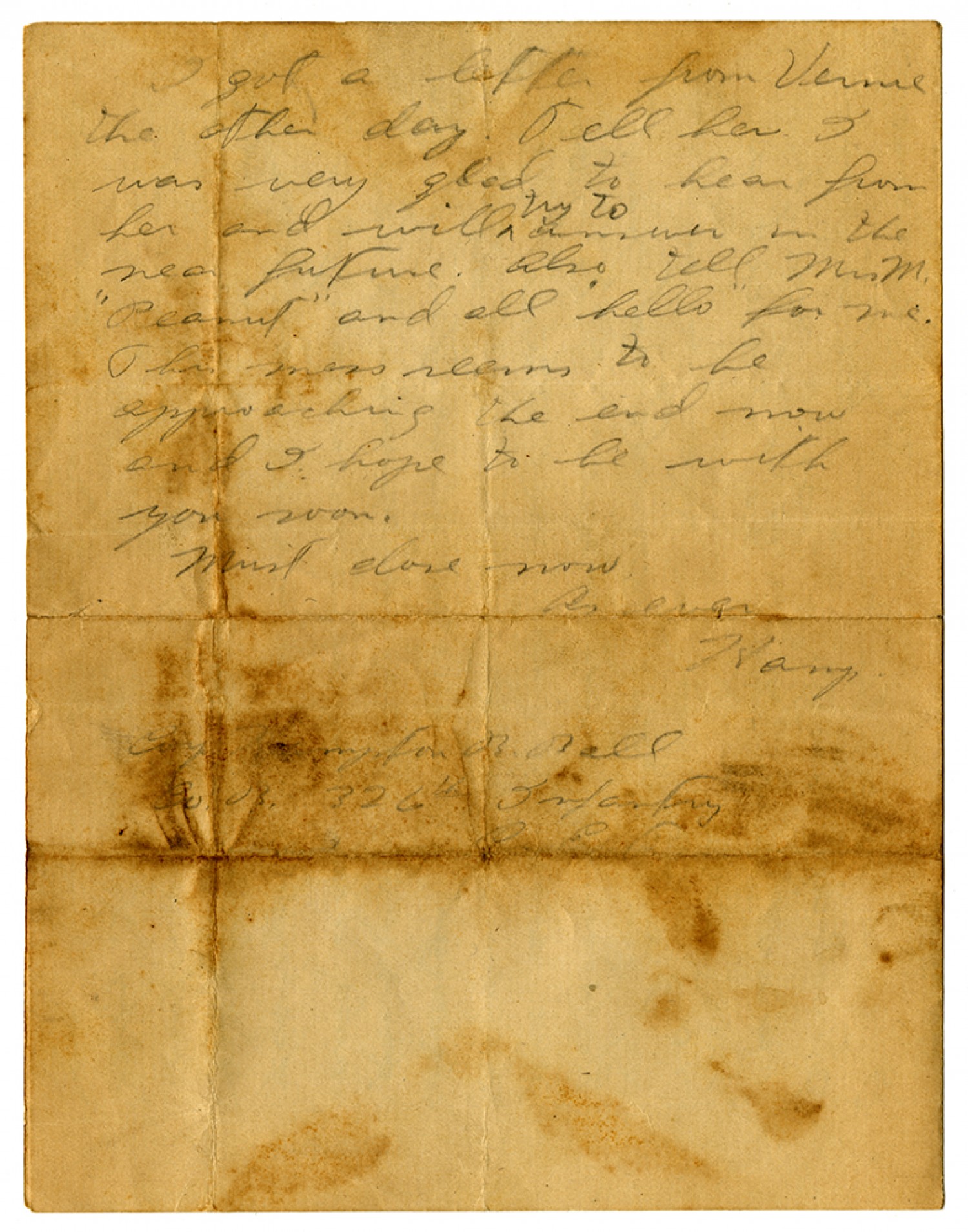 I got a letter from Vernie the other day. Tell her I was very glad to hear from her and will try to answer in the near future. Also tell Mrs M. "Peanut" and all "hello" for me. The wars seem to be approaching the end now and I hope to be with you soon. Must close now. As ever Hamp. Corp. Hampton B. Ball Co. B. 326th Infantry A.E.F.