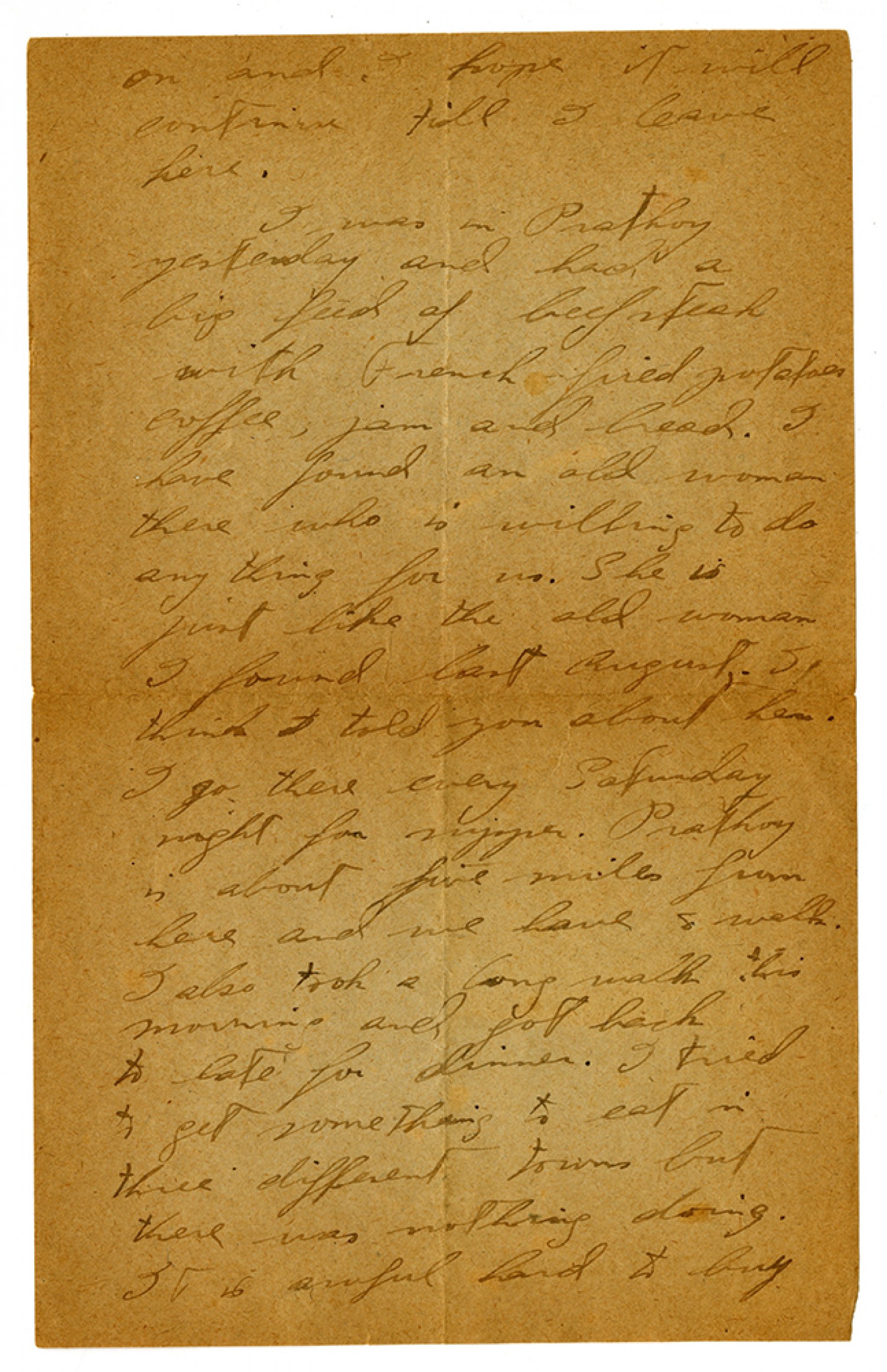 on and I hope it will continue till I leave here. I was in Prathoy yesterday and had a big feed of beef steak with French fried potatoes coffee, jam and bread. I have found an old woman there who is willing to do any thing for us. She is just like the old woman I found last August. I think I told you about her. I go there every Saturday night for supper. Prathoy is about five miles from here and we have to walk. I also took a long walk this morning and got back to late for dinner. I tried to get something to eat in three different towns but there was nothing doing. It is awful hard to buy