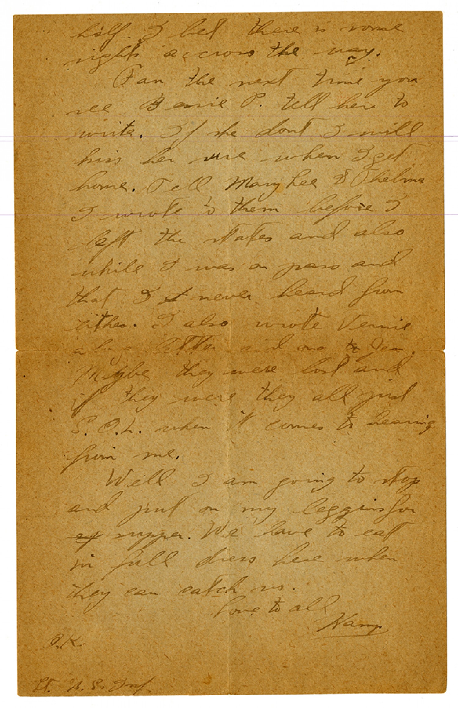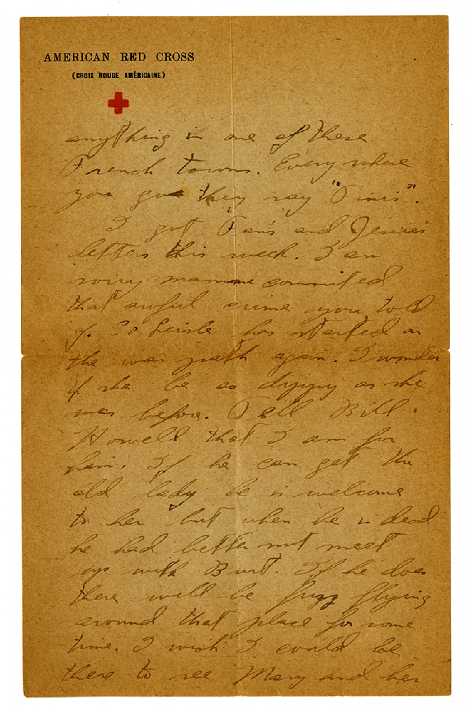 anything in one of these French towns. Everywhere you go they say "Finis". I got Fan's and Jessies' letters this week. I am sorry mama commited that awful crime you told of. So Leisle has started on the war path again. I wonder if she be as [ms illegible: 1 wd] as she was before. Tell Bill Howell that I am for him. If he can get the old lady he is welcome to her but when he is dead he had better not meet up with Burt. If he does there will be frizz flying around that place for some time. I wish I could be there to see Mary and her
