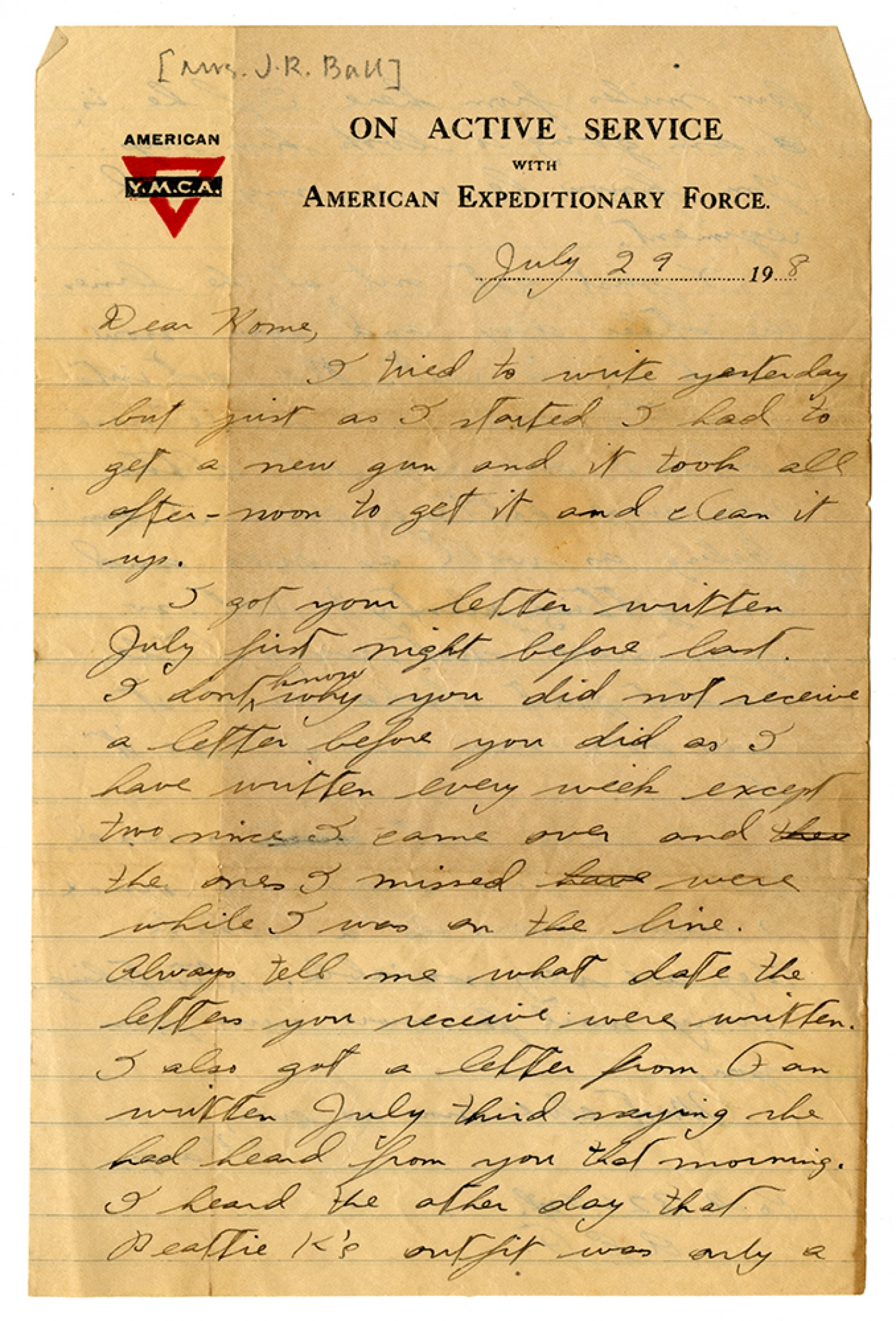 July 29, 1918 Dear Home, I tried to write yesterday but just as I started I had to get a new gun and it took all after-noon to get it and clean it up. I got your letter written July first night before last. I don't know why you did as I have written every week except two since I came over and the ones I missed were while I was on the line. Always tell me what date the letters you receive were written. I also got a letter from Fan written July third saying she had heard from you that morning. I heard the other day that Peattie K's outfit was only a