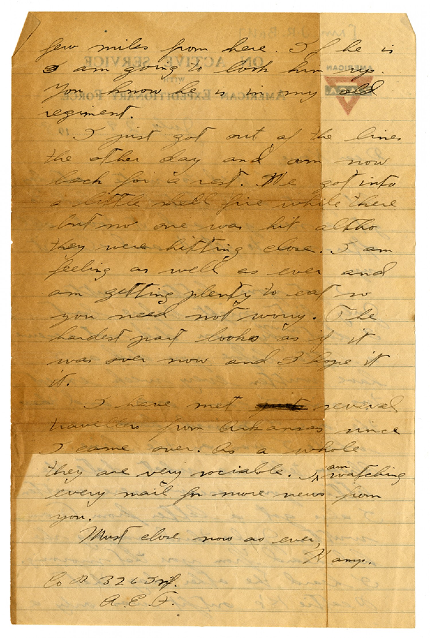 few miles from here. If he is I am going to look him up. You know he is in my old regiment. I just got out of the lines the other day and am now back for a rest. We got into a little shell fire while there but no one was hit altho they were hitting close. I am feeling as well as ever and am getting plenty to eat so you need not worry. The hardest part looks as if it was over now and I hope it is. I have met several travellers from Arkansas since I came over. As a whole they are very sociable. I am watching every mail for more news from you. Must close now as ever, Hamp. Co B 326 Inf. A.E.F.