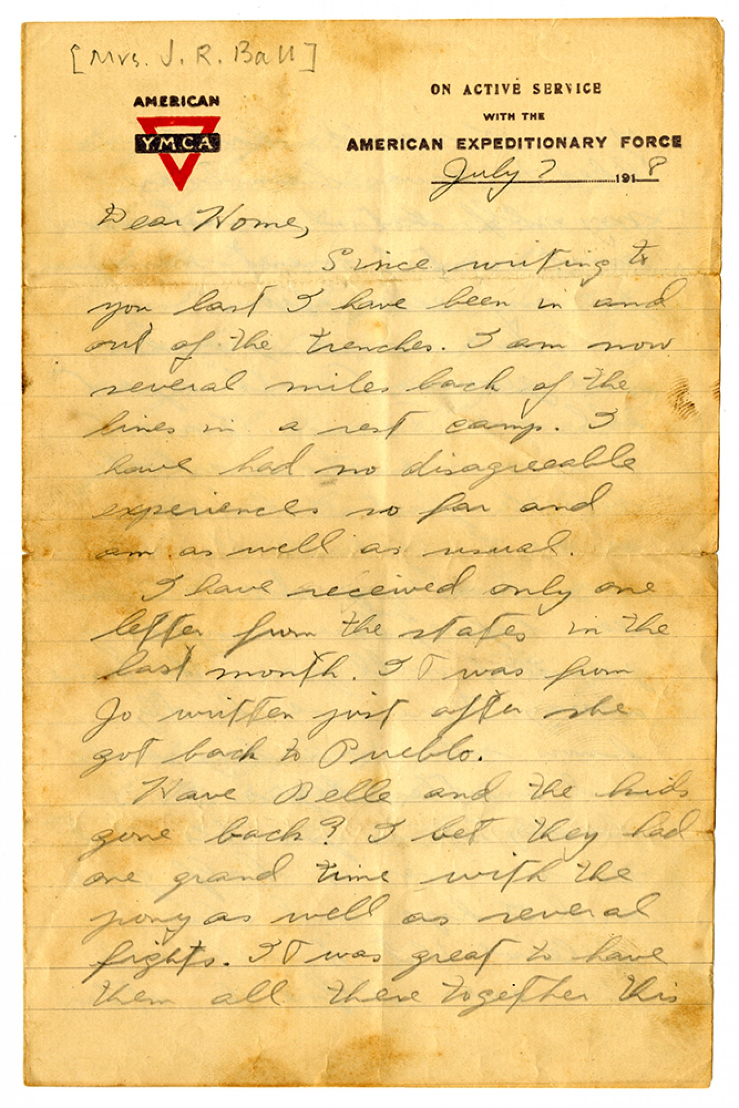 | Source | Ball, Hampton B. Letter to home. 07 July 1918. Ball, Hampton B., Papers, 1918-1919. C3935. The State Historical Society of Missouri, Columbia, MO. |
