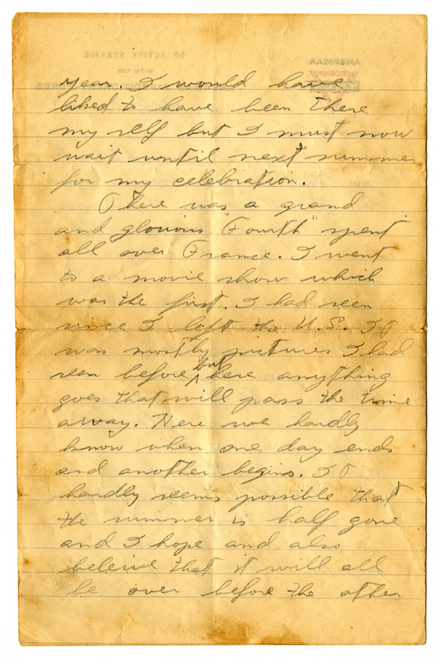 year. I would have liked to have been there my self but I must now wait until next summer for my celebration. There was a grand and glorious "Fourth" spent all over France. I went to a movie show which was the first I had seen since I left the U.S. It was mostly pictures I had seen before but here anything goes that will pass the time away. Here we hardly know when one day ends and another begins. It hardly seems possible that the summer is half gone and I hope and also beleive that it will all be over before other