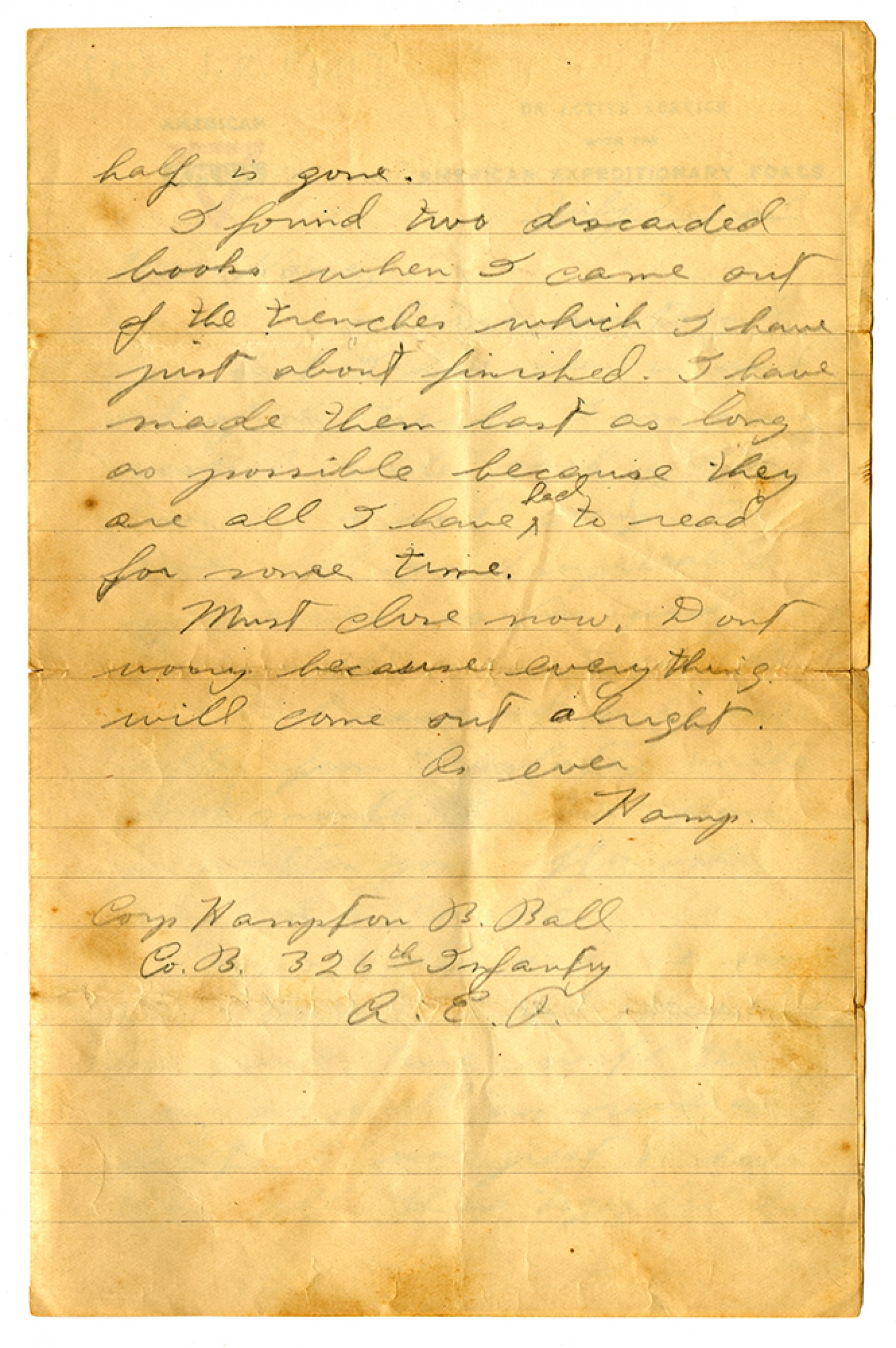 half is gone. I found two discarded books when I came out of the trenches which I have just about finished. I have made them last as long as possible because they are all I have had to read for some time. Must close now. Dont worry because every thing will come out alright. As ever Hamp. Corp Hampton B. Ball Co. B. 326th Infantry A. E. F.