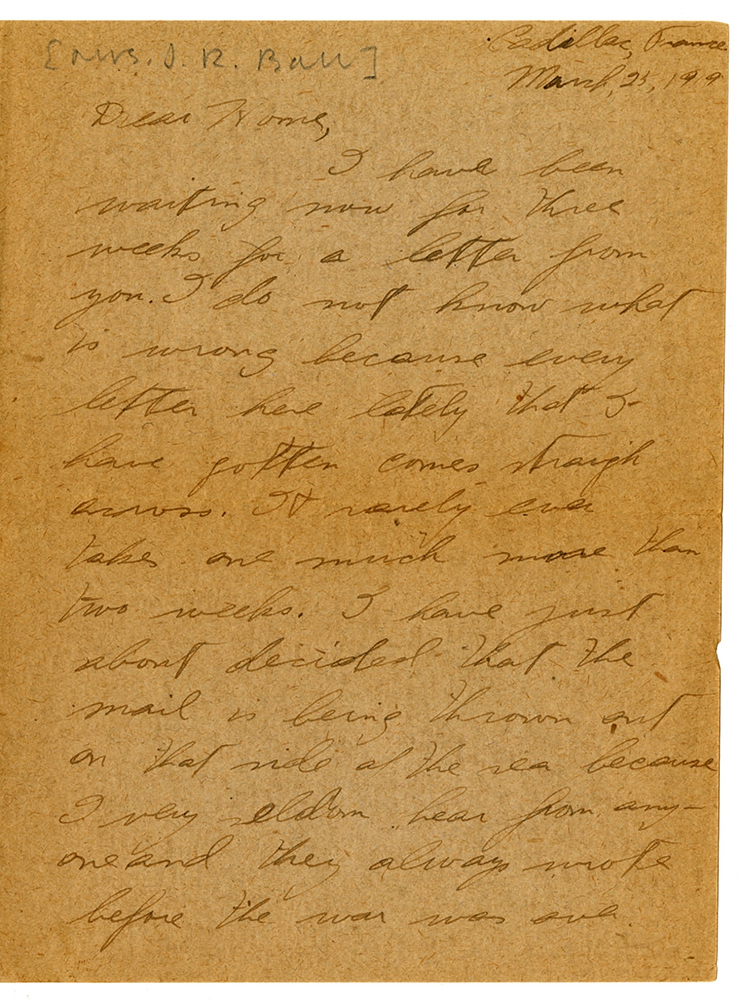 Cadillac, France. March 25, 1919 Dear Home, I have been waiting now for three weeks for a letter from you. I do not know what is wrong because every letter here lately that I have gotten comes straigh across. It rarely ever takes one much more than two weeks. I have just about decided that the mail is being thrown out on that ride of the sea because I very seldom hear from any one and they always wrote before the war was over.