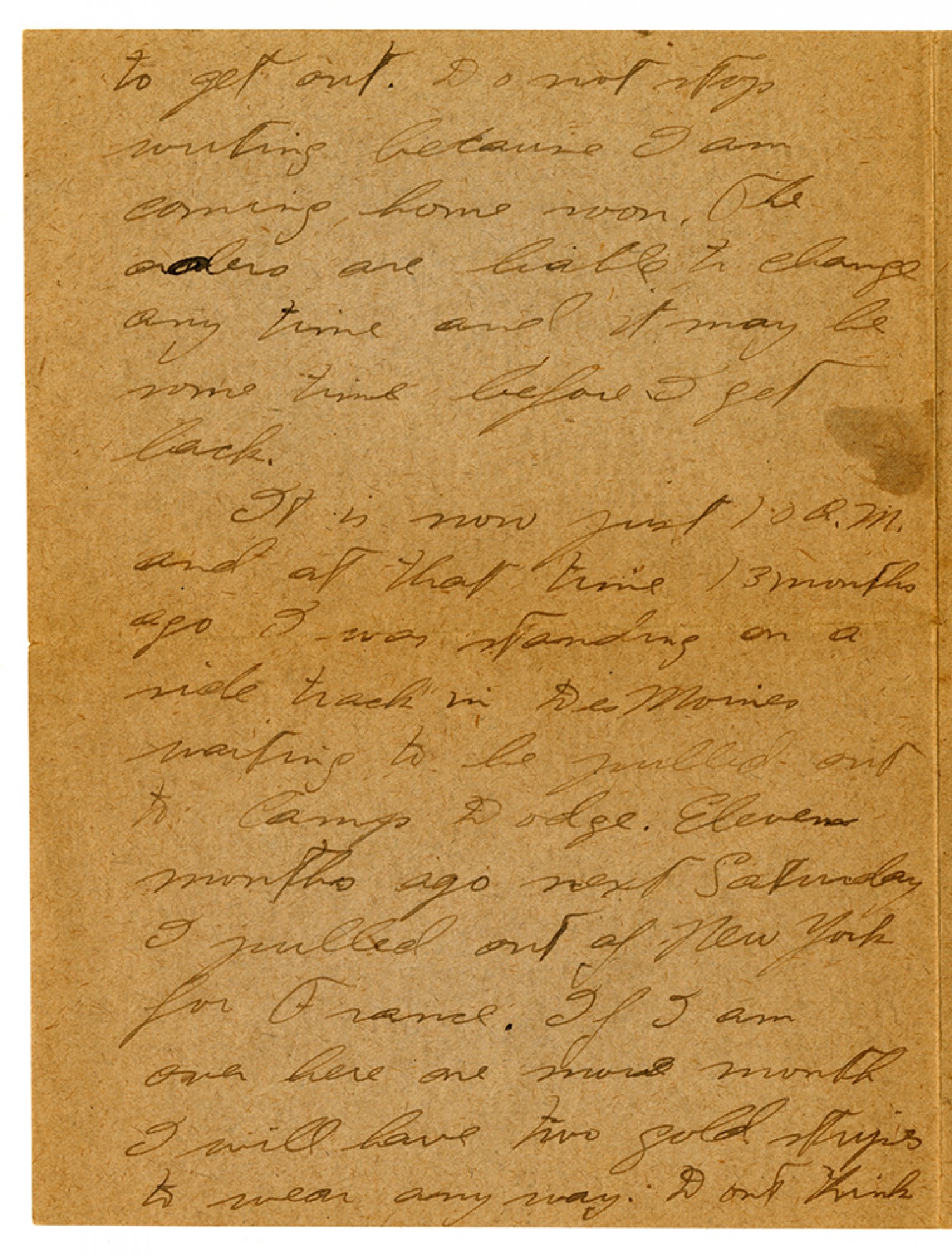 to get out. Do not stop writing because I am coming home soon. The orders are liable to change any time and it may be some time before I get back. It is now just 10 a.m. and at that time 13 months ago I was standing on a ride track in Des Moines wanting to be pulled out to Camp Dodge. Eleven months ago next Saturday I pulled out of New York for France. If I am over here one more month I will have two gold stripes to wear any way. Dont think
