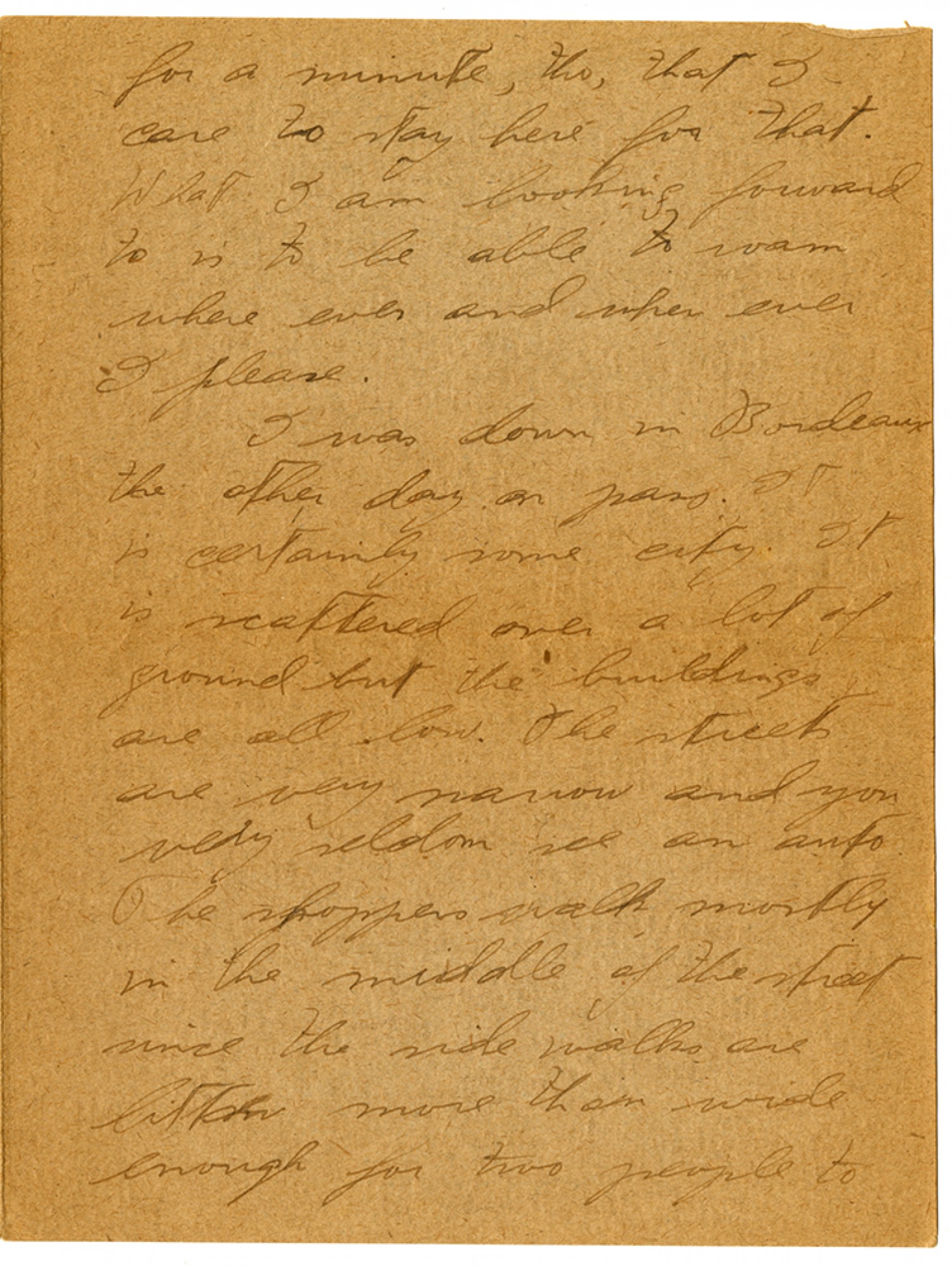 for a minute, tho, that I care to stay here for that. What I am looking forward to is to be able to roam where ever and when ever I please. I was down in Bordeaux the other day on pass. It is certainly some city. It is scattered over a lot of ground but the buildings are all low. The streets are very narrow and you very seldom see an auto. The shoppers walk mostly in the middle of the street since the ride walks are little more than wide enough for two people to