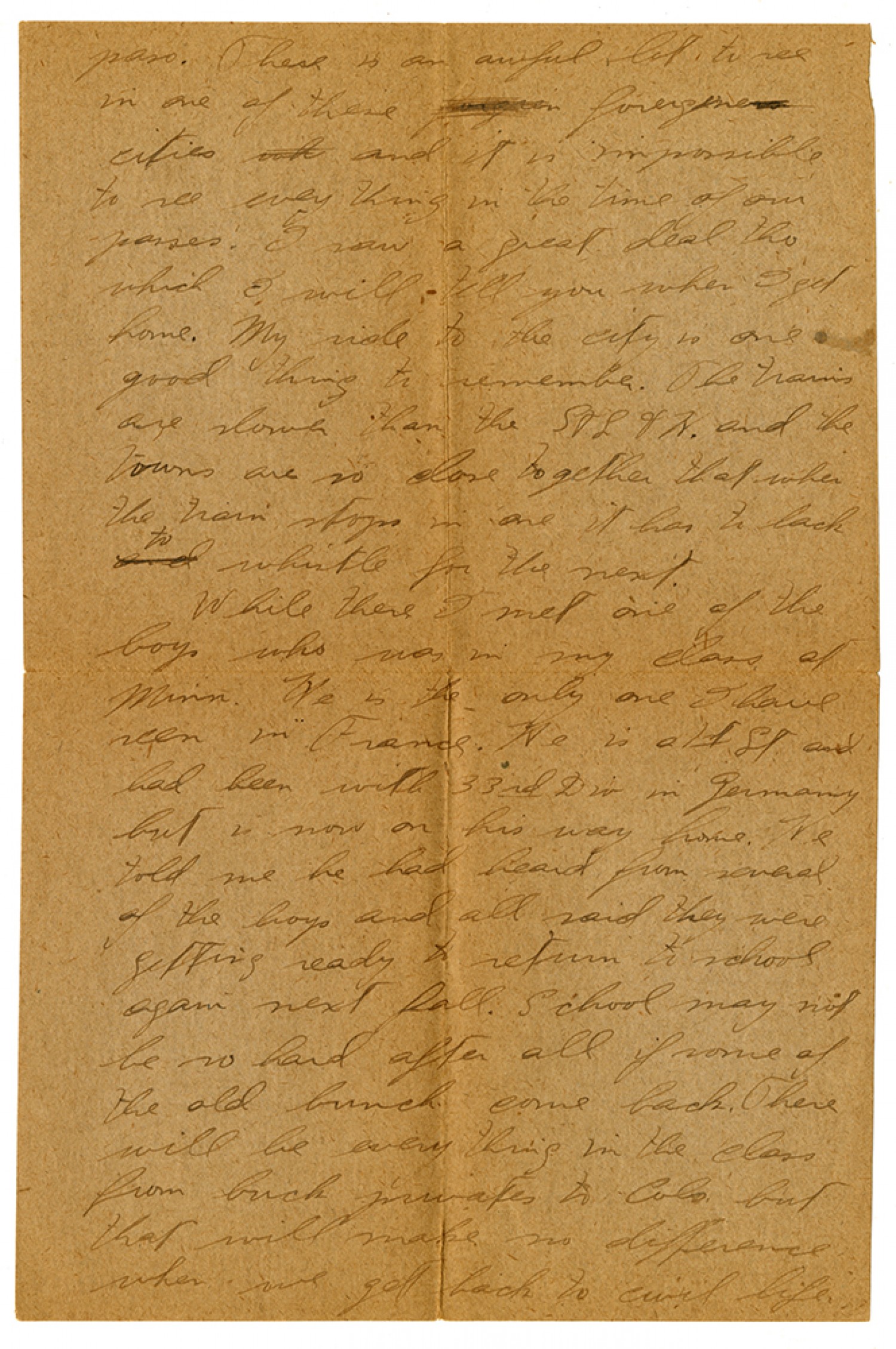 pass. There is an awful lot to see in one of these [ms illegible: 1 wd] cities and it is impossible to see every thing in the time of our passes. I saw a great deal tho which I will tell you when I get home. My ride to the city is one good thing to remember. The trains are slower than the [ms illegible: 1 wd] and the towns are so close together that when the train stops in one it has to lock to whistle for the next. While there I met one of the boys who was in my class at [Minnesota]. He is the only one I have seen in France. He is a 1st Lt and had been with 33rd Div in Germany but is now on his way home. He told me he had heard from several of the boys and all said they were getting ready to return to school again next fall. School may not be so hard after all if some of the old bunch come back. There will be every thing in the class from buck privates to Cols. but that will make no difference when we get back to civil life.