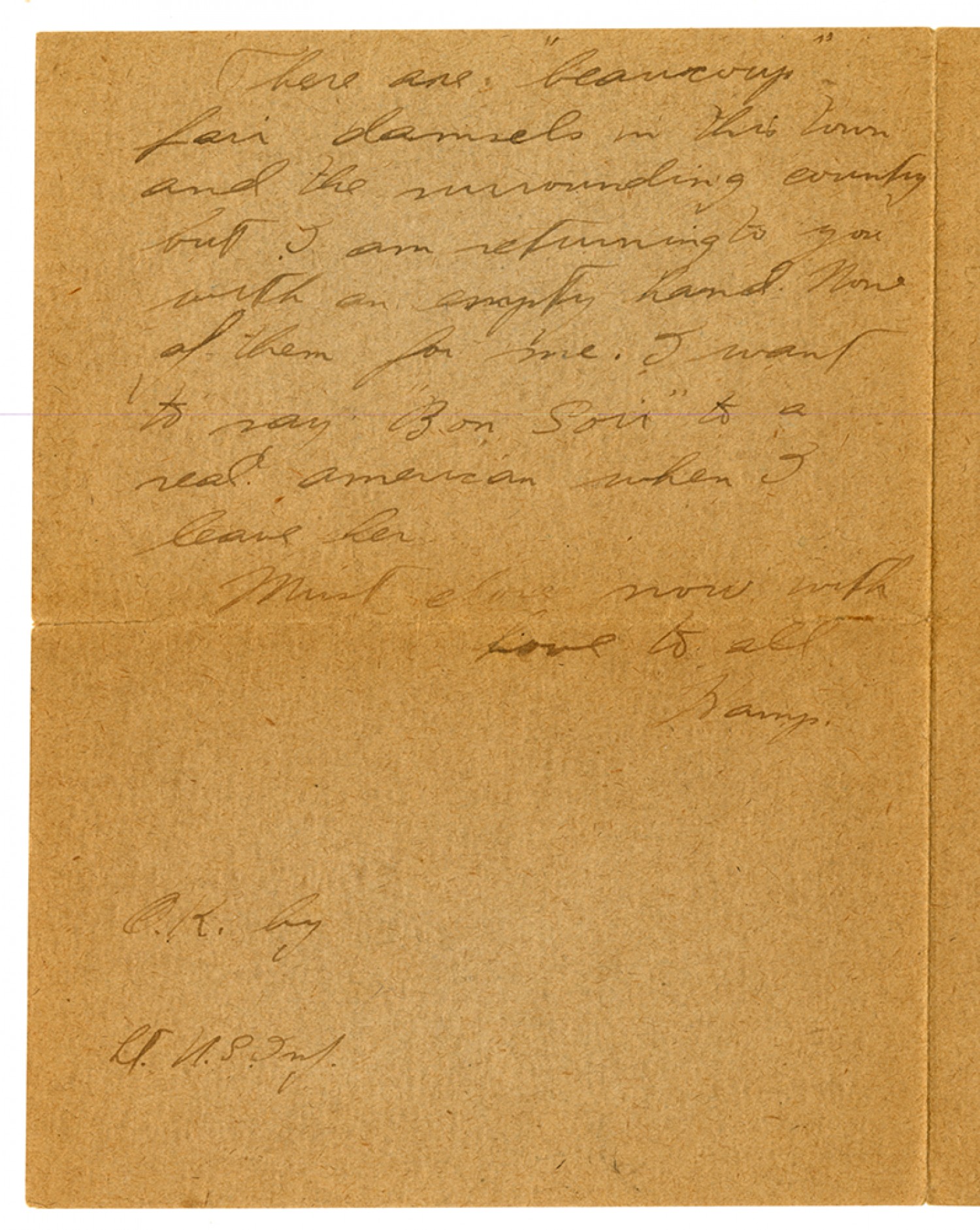 There are "beaucoup" fair damsels in this town and the surrounding country but I am returning to you with an empty hand. None of them for me. I want to say "Bon Soir" to a real American when I leave her Must close now with Love to all Hamp. [censor signature]