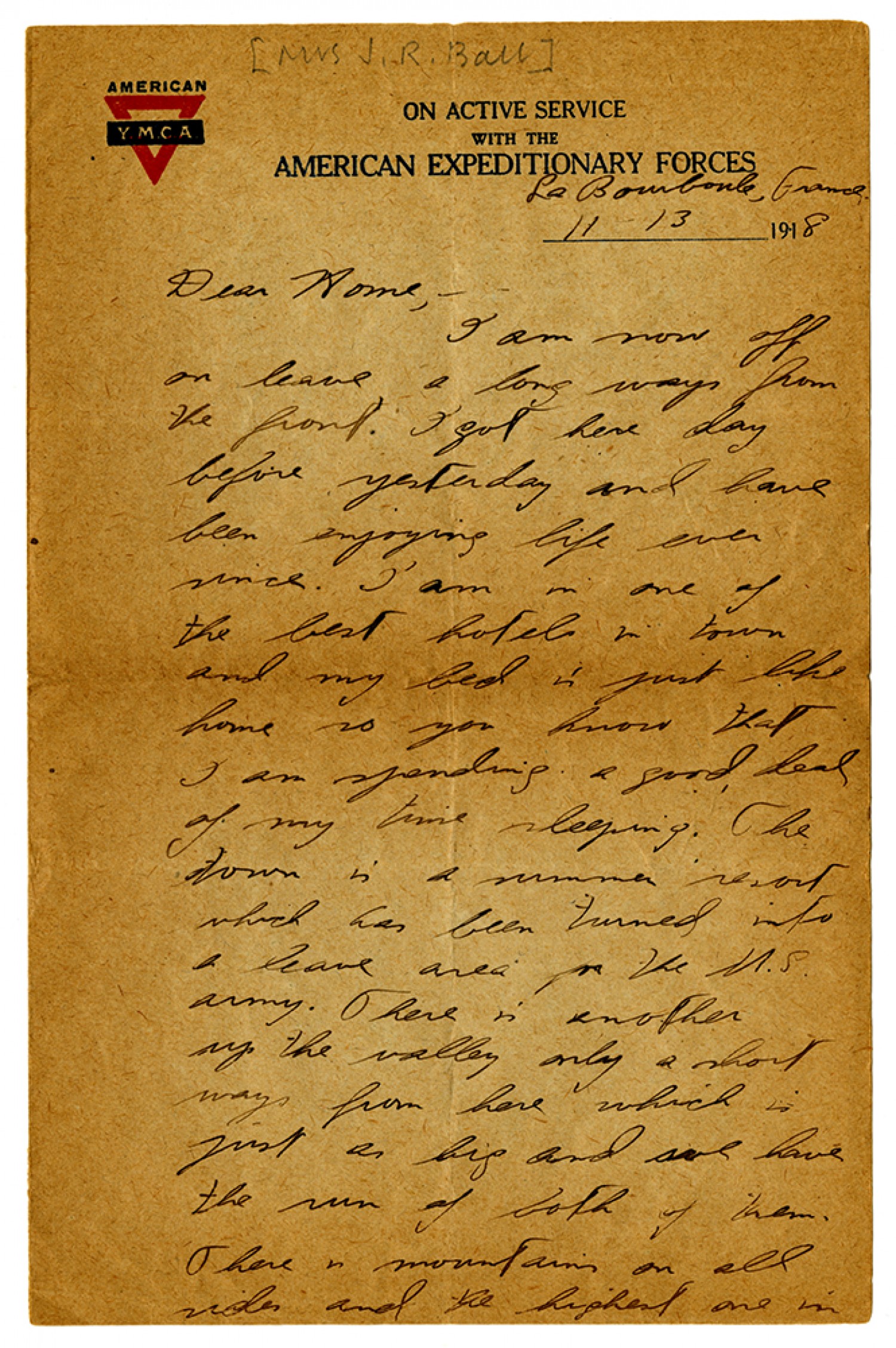 | Source | Ball, Hampton B. Letter to home. 13 November 1918. Ball, Hampton B., Papers, 1918-1919. C3935. The State Historical Society of Missouri, Columbia, MO. |