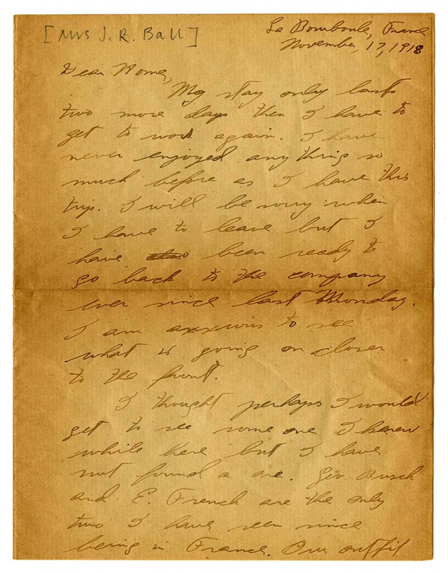 | Source | Ball, Hampton B. Letter to home. 17 November 1918. Ball, Hampton B., Papers, 1918-1919. C3935. The State Historical Society of Missouri, Columbia, MO. |