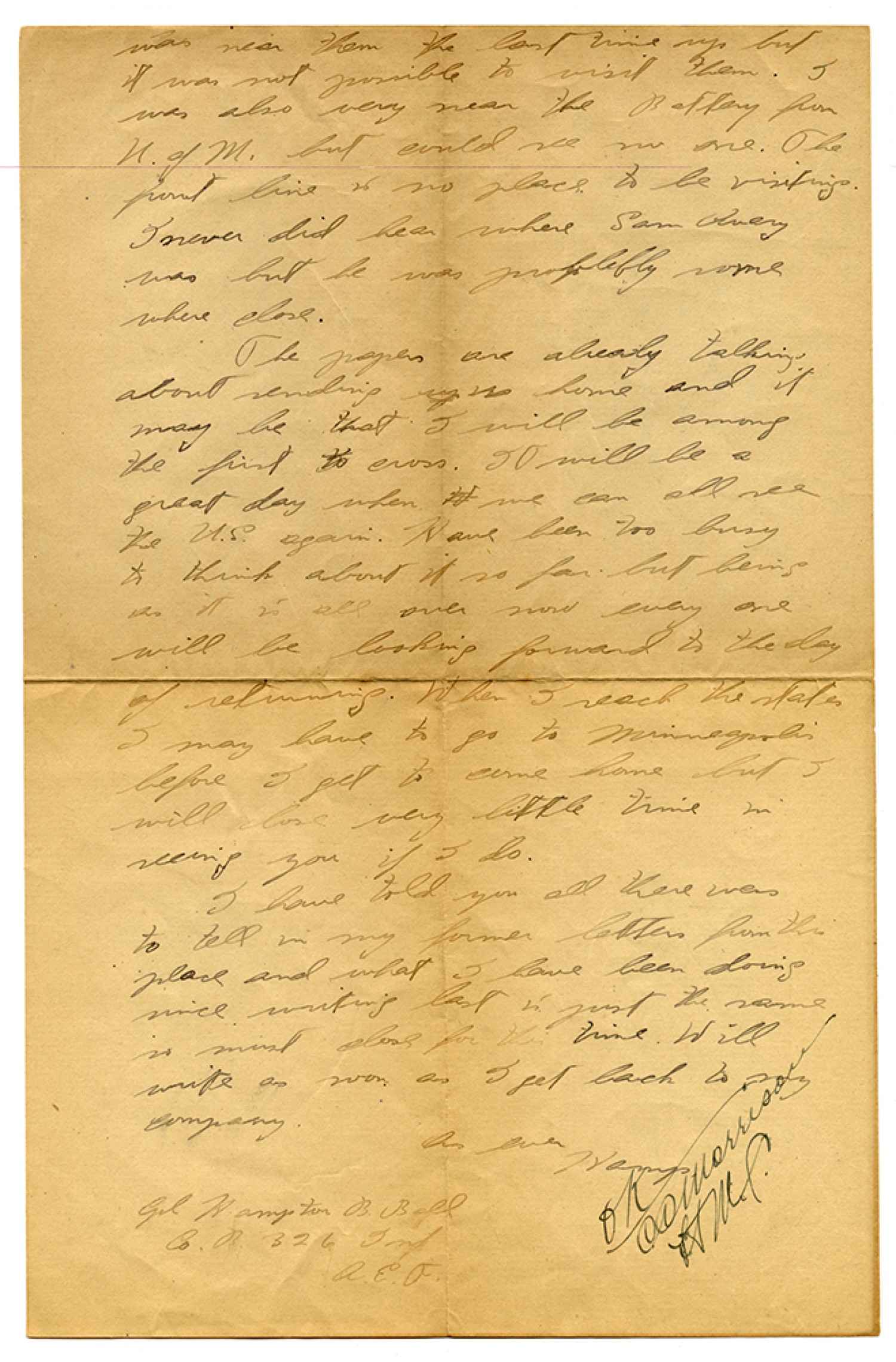 was near them the last time up but it was not possible to visit them. I was also very near the Bathory farm N. of M. but could see no one. The front line is no place to be visiting. I never did hear where Sam Avery was but he was probably some where close. The papers are already talking about sending us home and it may be that I will be among the first to cross. It will be a great day when we can all see the U.S. again. Have been too busy to think about it so far but being as it is all over now every one will be looking forward to the day of returning. When I reach the states I I may have to go to Minneapolis before I get to come home but I will lose very little time in seeing you if I do. I have told you all there was to tell in my former letters from the place and what I have been doing since writing last is just the same so must close for the time. Will write as soon as I get back to my company. As ever Hamp. Cpl Hampton B. Ball Co. B 326 Inf. A.E.F. [censor signature]