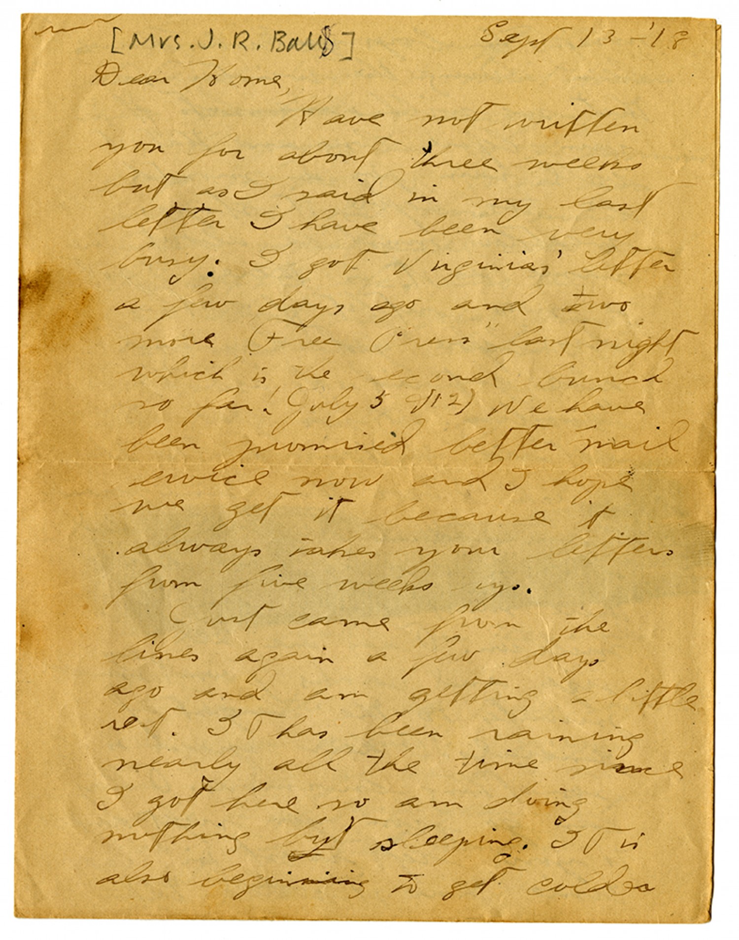 [September 13, 1918] Dear Home, Have not written you for about three weeks but as I said in my last letter I have been very busy. I got Virginia's letter a few days ago and two more Free Press' last night which is the second bunch so far. (July 5 & 12) We have been promised better mail service now and I hope we get it because it always takes your letters from five weeks ago. Just came from the lines again a few days ago and am getting a little rest. It has been raining early all the time since I got here so am doing nothing but sleeping. It is also beginning to get colder