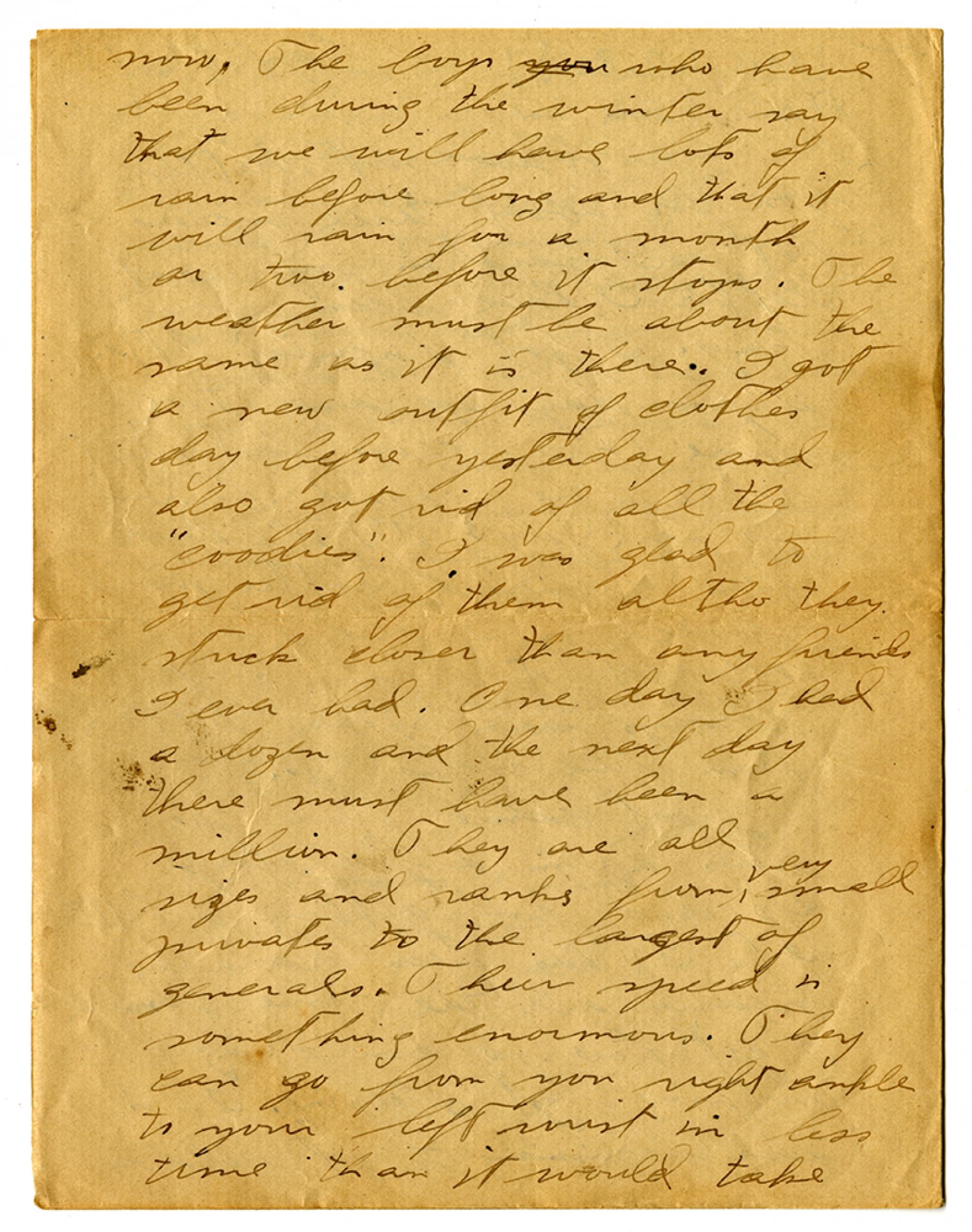 now, The boys who have been during the winter say that we will have lots of rain before long and that it will rain for a month or two before it stops. The weather must be about the same as it is there. I got a new outfit of clothes day before yesterday and also got rid of all the "coodies." I was glad to get rid of them altho they stuck closer than any friends I ever had. One day I had a dozen and the next day there must have been a million. They are all sizes and ranks from very small privates to the largest of generals. Their speed is something enormous. They can go from your right ankle to your left wrist in less time than it would take