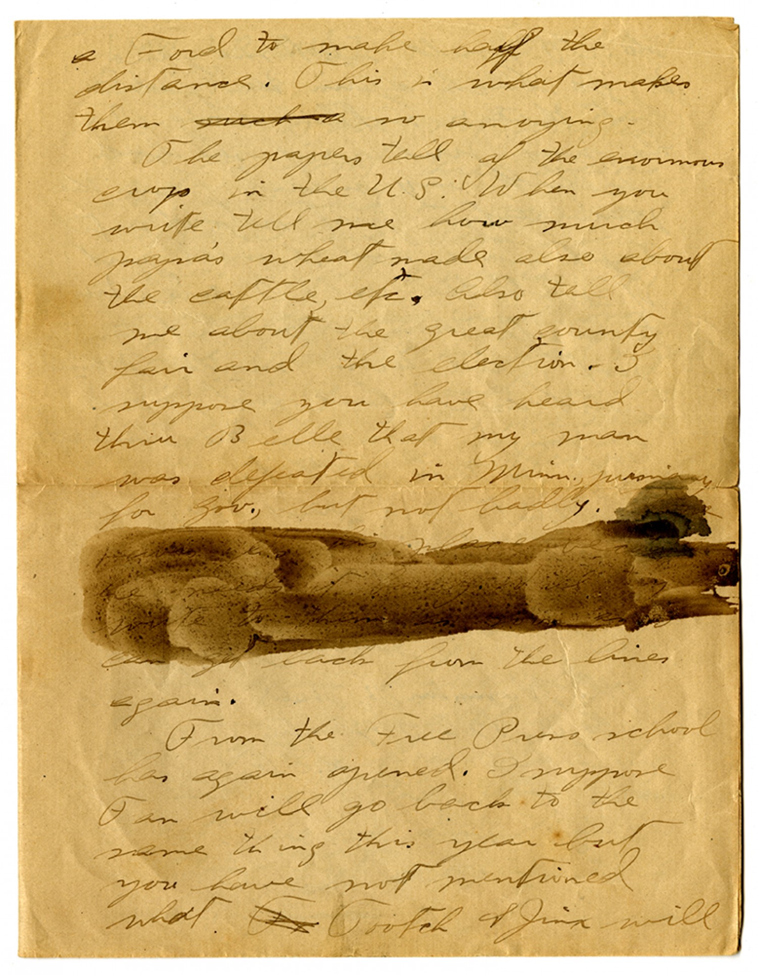 a Ford to make half the distance. This is what makes them so annoying. The papers tell of the enormous crop in the U.S. When you write tell me how much papa's wheat made also about the cattle, etc. Also tell me about the great country fair and the election. I suppose you have heard thru Belle that my man was defeated in [Minnesota] primary for Gov., but not badly. [ms illegible] Can get back from the lines again. From the Free Press school has again opened. I suppose Fran will go back to the same thing this year but you have not mentioned what. Tootch & Jim will