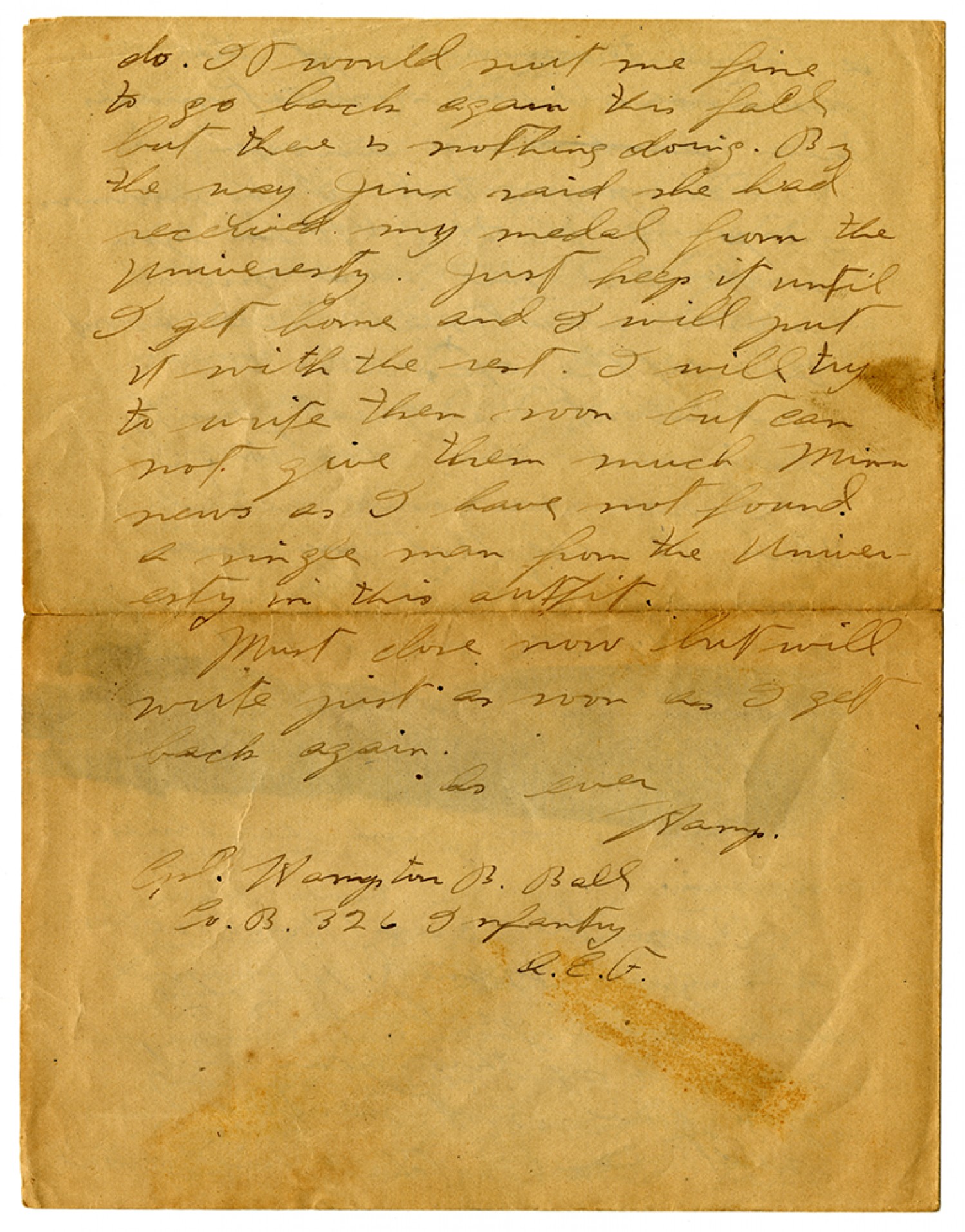 do. It would suit me fine to go back again this fall but there is nothing doing. By the way Jinx said she had recieved my medal from the university. Just keep it until I get home and I will put it with the rest. I will try to write them soon but can not give them much Minn news as I have not found a single man from the University in this outfit. Must close now but will write just as soon as I get back again. As ever Hamp. Cpl. Hampton B. Ball Co.B. 326 Infantry A.E.F.