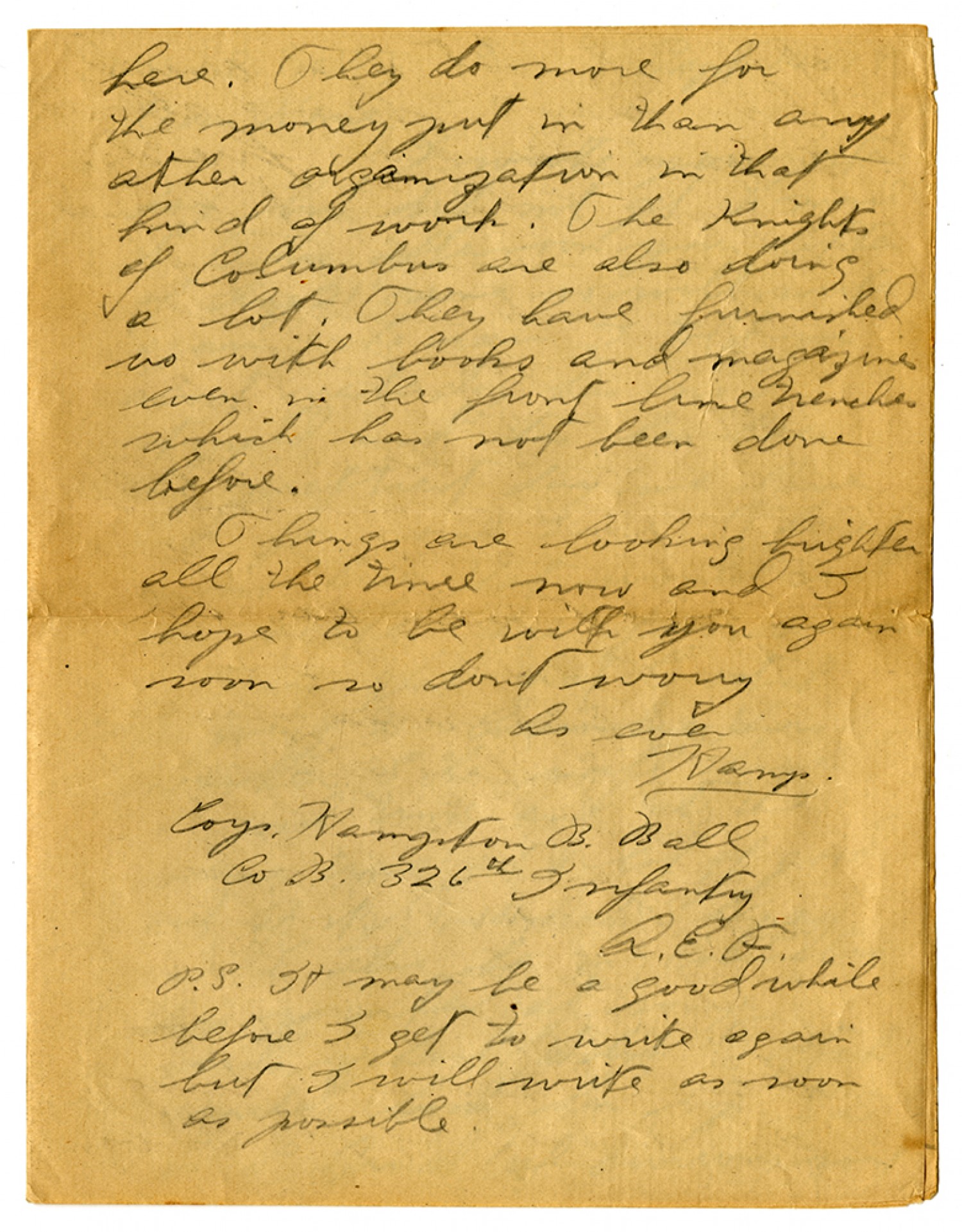here. They do more for the money put in than any other organization in that kind of work. The Knights of Columbus are also doing a bit. They have furnished us with books and magazine even in the front line trenches which has not been done before. Things are looking brighter all the time now and I hope to be with you again soon so dont worry As ever Hamp. Corp. Hampton B. Ball Co B. 326th Infantry A.E.F. P.S. It may be a good while before I get to write again but I will write as soon as possible.