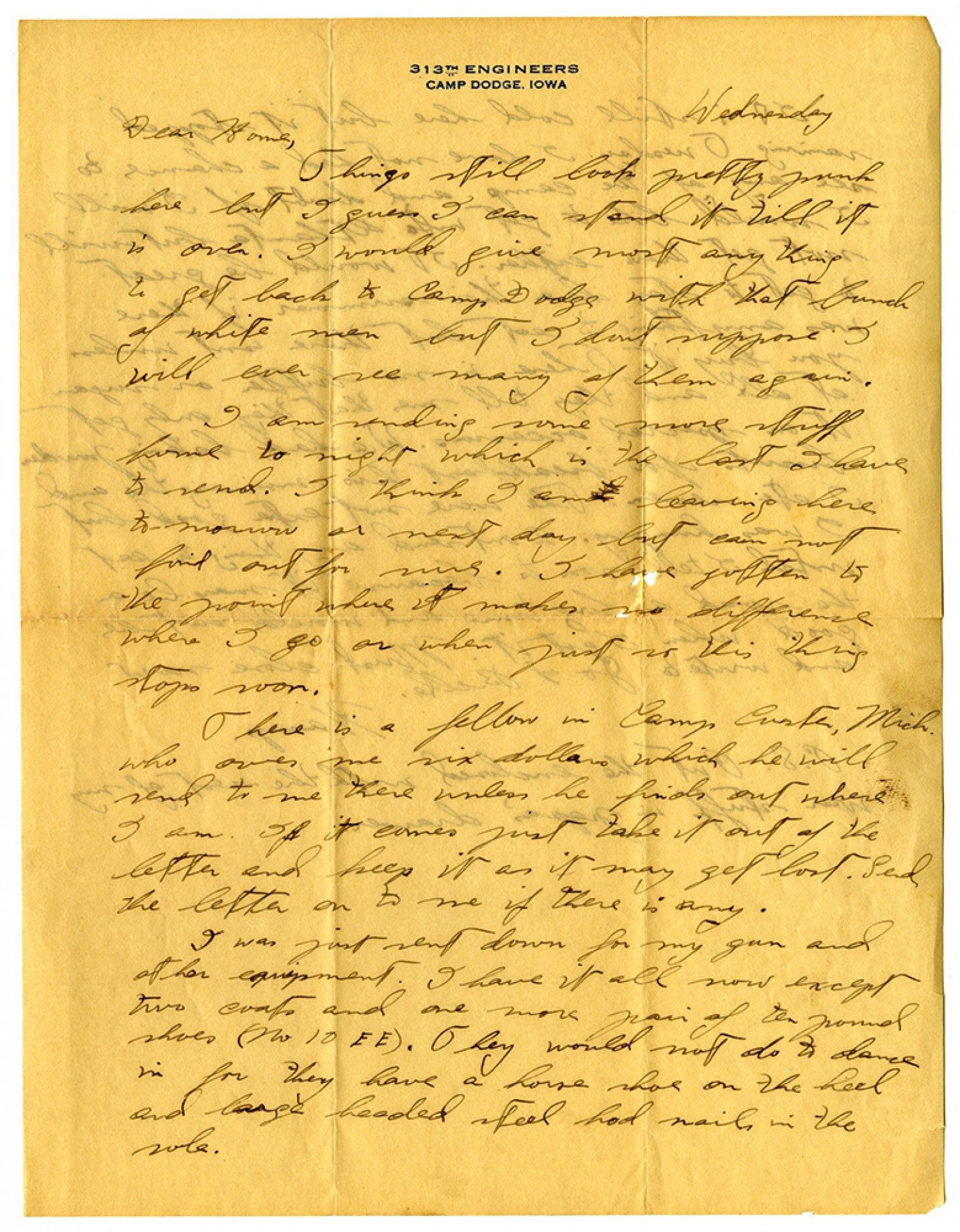 Wednesday Dear Home, Things still look pretty [ms Illegible: 1 wd] here but I guess I can stand it till it is over. I would give most any thing to get back to Camp Dodge with that bunch of white men but I don't suppose I will ever see many of them again. I am sending some more stuff home to night which is the last I have to send. I think I am leaving here to-morrow or next day but can not find out for sure. I have gotten to the point where it makes no difference where I go or when first so this thing stops soon. There is a fellow in Camp Custer, [Michigan] who owes me six dollars which he will send to me there unless he finds out where I am. If it comes just take it out of the letter and keep it as it may get lost. Send the letter on to me if there is any. I was just sent down for my gun and other equipment. I have it all now except two coats and one more pair of ten pound shoes (No 10 E E). They would not do to dance in for they have a horse shoe on the heel and a large headed steel had nails in the sole.