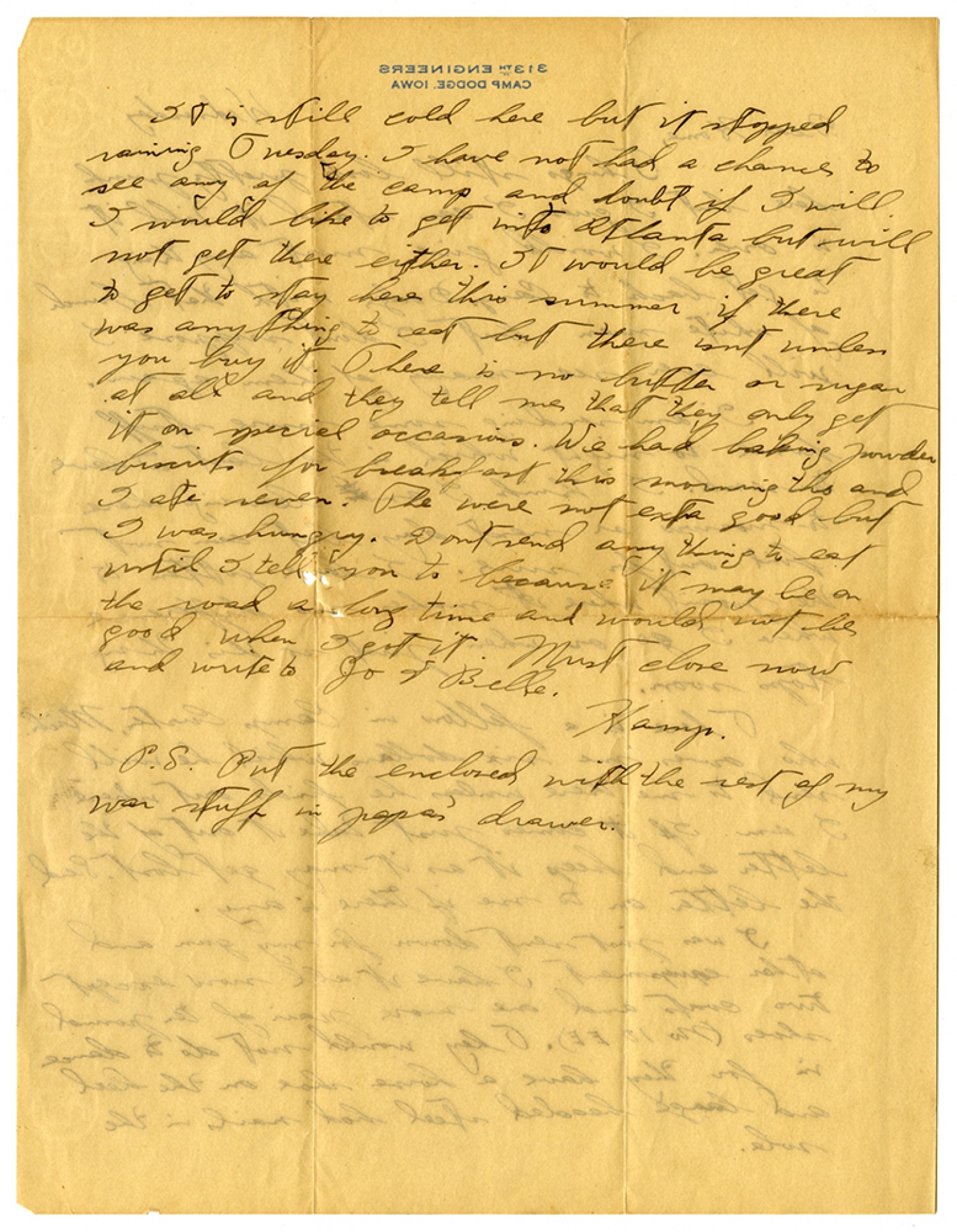 It is still cold here but it stopped raining Tuesday. I have not had a chance to see any of the camp and doubt if I will. I would like to get into Atlanta but will not get there either. It would be great to get to stay here this summer if there was anything to eat but there isnt unless you buy it. There is no butter or sugar at all and they tell me that they only get it on special occasions. We had baking powder biscuits for breakfast this morning tho and I ate seven. The were not extra good but I was hungry. Dont send any thing to eat until I tell you to because it may be on the road a long time and would not be good when I got it. Must close now and write to Jo & Belle. Hamp. P.S. Put the enclosed with the rest of my war stuff in papa's drawer.