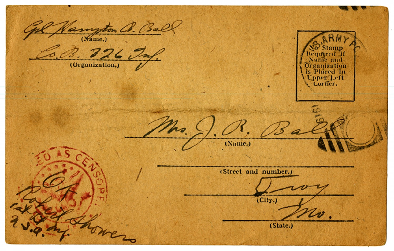 Cpl Hampton B. Ball Co. B. 326 Inf. Mrs. J.R. Ball Troy Mo. [censor signature]