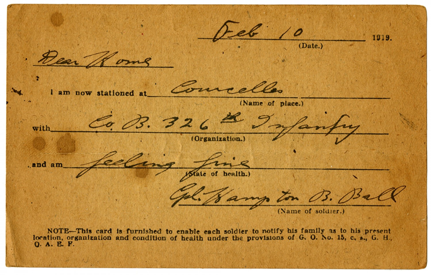 [February] 10, 1919 Dear Home I am now stationed at Courcelles with Co. B. 326th Infantry and am feeling fine Cpl. Hampton B. Ball