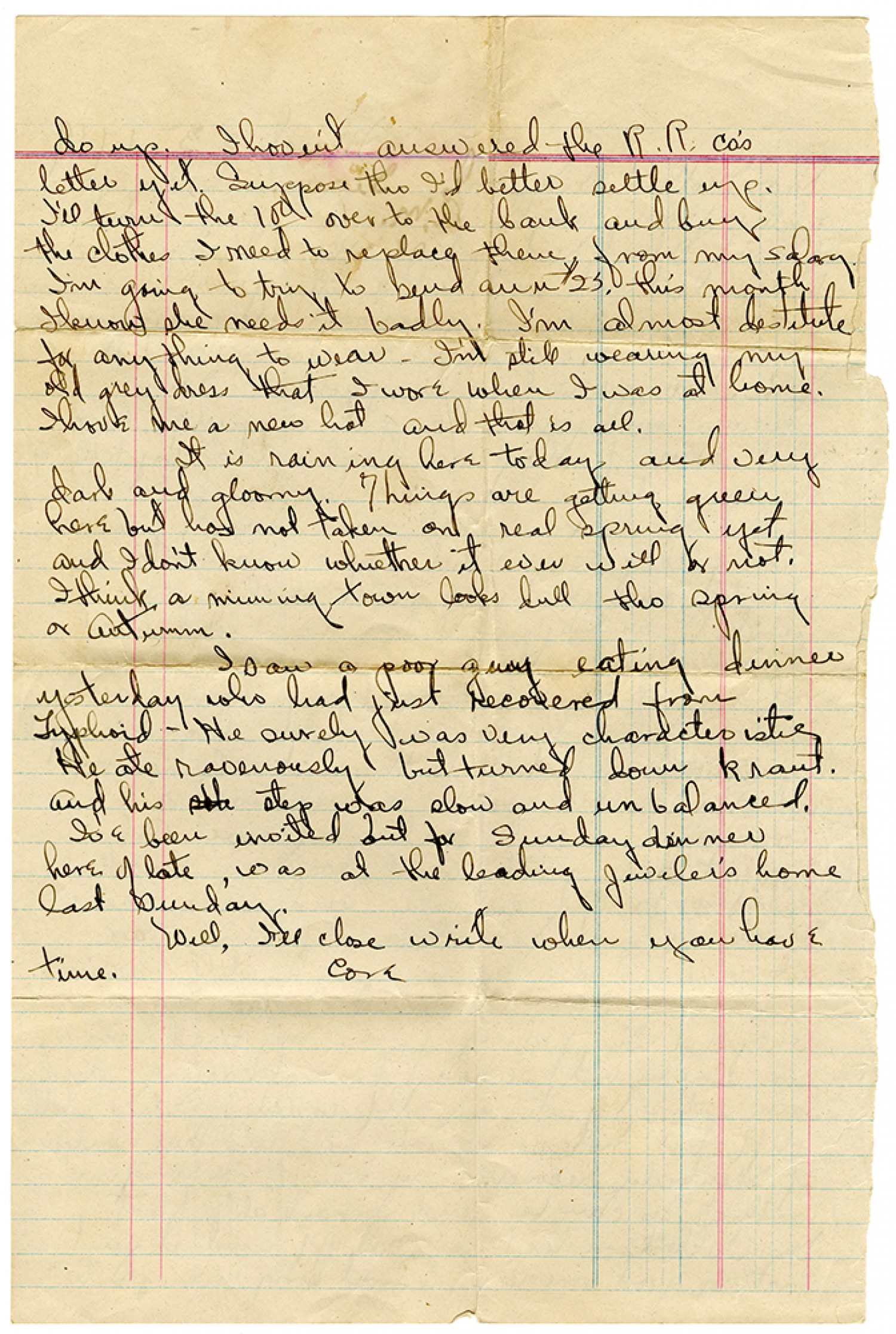 do up. I haven't answered the R.R. co's letter yet. Suppose tho I'd better settle up. I'll turn the 100 over to the bank and buy the clothes I need to replace them from my salary. I'm going to try to send Ann $25 this month I know she needs it badly. I'm almost destitute for any thing to wear. I'm still wearing my old grey dress that I wore when I was at home. I have me a new hat and that is all. It is raining here today and very dark and gloomy. Things are getting green here but has not taken on real spring yet and I don't know whether it ever will or not. I think a mining town looks dull tho spring or autumn. I saw a poor guy eating dinner yesterday who had just recovered from Typhoid. He surely was very characteristic He ate ravenously, but turned down kraut. and his step was slow and unbalanced. I've been invited but for Sunday dinner here of late, was at the leading Jeweler's home last Sunday. Well, I'll close write when you have time. Cora