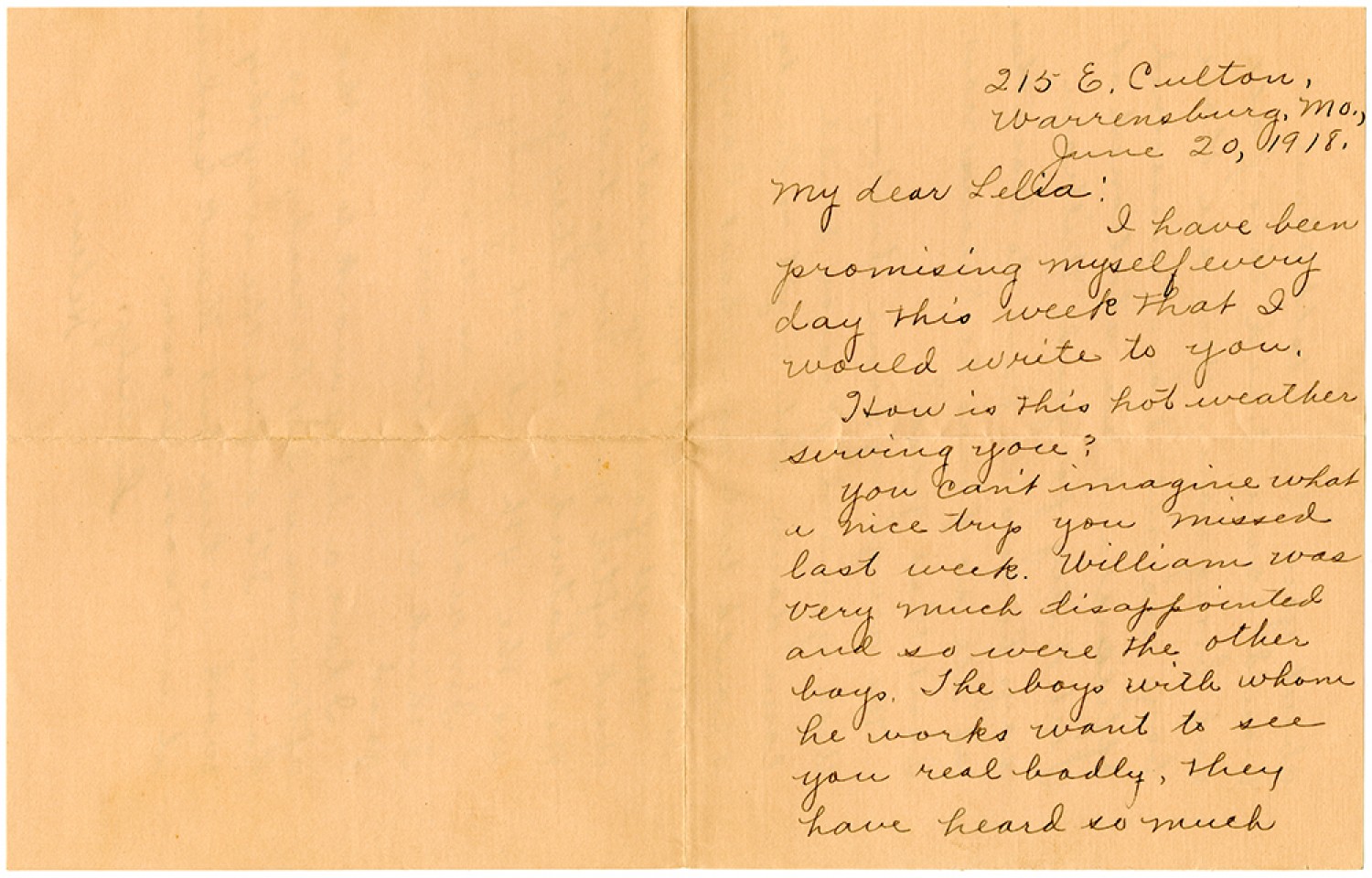 215 E. Culton, Warrensburg, [Missouri], June 20, 1918. My dear Lelia: I have been promising myself every day this week that I would write to you. How is this hot weather serving you? You can't imagine what a nice trys you missed last week. William was very much disappointed and so were the other boys. The boys with whom he works want to see you real badly, they have heard so much