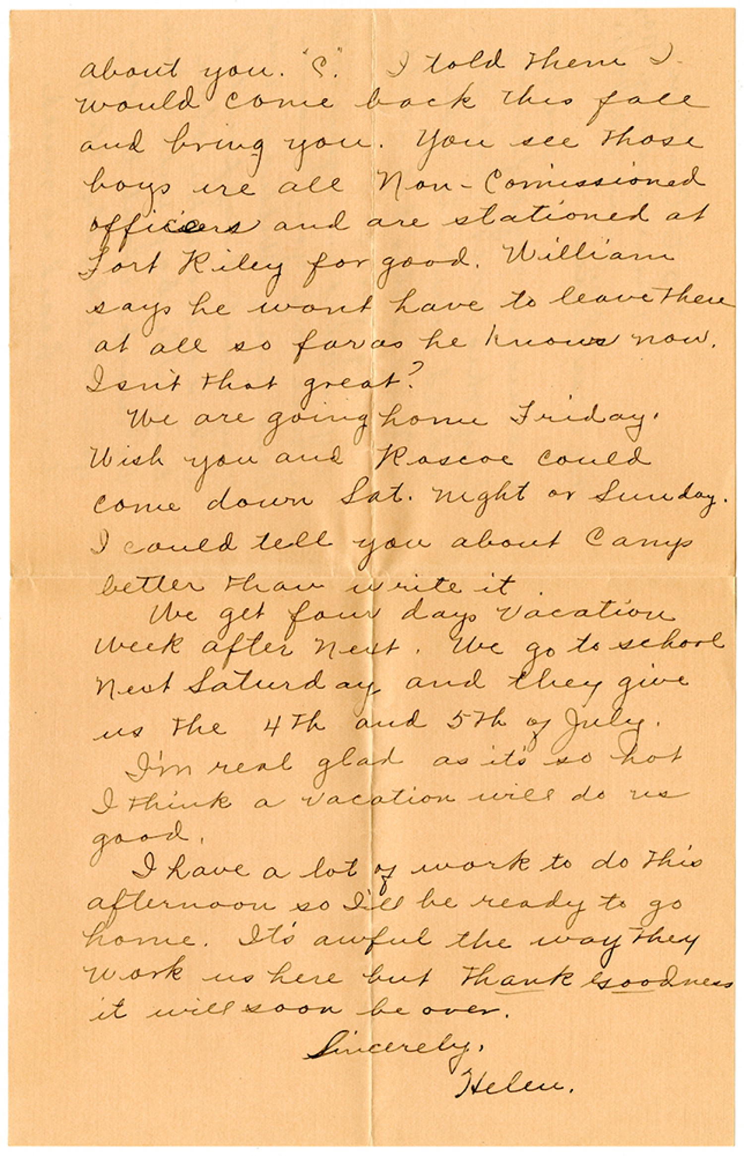 about you. "C". I told them I would come back this fall and bring you. You see those boys are all non-commissioned officers and are stationed at Fort Riley for good. William says he wont have to leave there at all so far as he knows now. Isn't that great? We are going home Friday. Wish you and Roscoe could come down Sat. night or Sunday. I could tell you about camp better than write it. We get four days vacation week after next. We go to school next Saturday and they give us the 4th and 5th of July. I'm real glad as it's so hot I think a vacation will do us good. I have a lot of work to do this afternoon so I'll be ready to home. It's awful the way they work us here but thank goodness it will soon be over. Sincerely, Helen.
