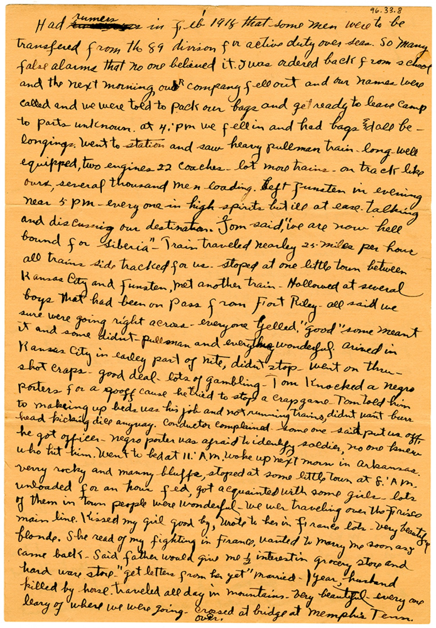 [page 1] Had rumers in [February] 1918 that some men were to be transfered from the 89 division for active duty over seas. So many false alarms that no one believed it. I was ordered back from school and the next morning our company fell out and our names were called and we were told to pack our bags and get ready to leave camp to parts unknown. At 4: pm we fell in and had bags and all belongings. Went to station and saw heavy pullman train long well equipped, two engines 22 coaches lot more trains on track like ours, several thousand men loading. Left [Camp Funston] in evening near 5 pm everyone in high spirits but ill at ease talking and discussing our destination. Tom said, "we are now hell bound for Siberia". Train traveled nearly 25 miles per hour all trains side tracked for us. stoped at one little town between Kansas City and [Camp Funston]. met another train. Hollowed at several boys Mat had been on pass from Fort Riley. all said we sure were going right across. everyone yelled, "good" some meant it and some didnt. pullman and everything wonderful arived in Kansas City in earley part of nite, didnt stop. went on thru. shot craps - good deal - lots of gambling. Tom Knocked a negro porters for a spooff cause he tried to stop a crap game. Tom told him to makeing up beds was his job and not running trains, didnt want burr head kicking dice anyway. conductor complained some one said put us off. he got officer - negro porter was afraid to identity soldier, no one knew who hit him. Went to bed at 11: A.M. woke up next morn in Arkansas. verry rocky and manny bluffs, stoped at some little town at 8: AM. unloaded for an hour fed, got acquainted with some girls - lots of them in town people were wonderful. we wer traveling over the Frisco main line. Kissed my girl good by, wrote to her in France lots - very beautiful blonde. She read of my fighting in France. wanted to marry me soon as I came back. Said father would give me ½ interest in grocery store and hard ware store. "get letters from her yet” married - 1 year, husband killed by horse. traveled all day in mountains. very beautiful - every one leary of where we were going. crossed at bridge at Memphis [Tennessee]. over.