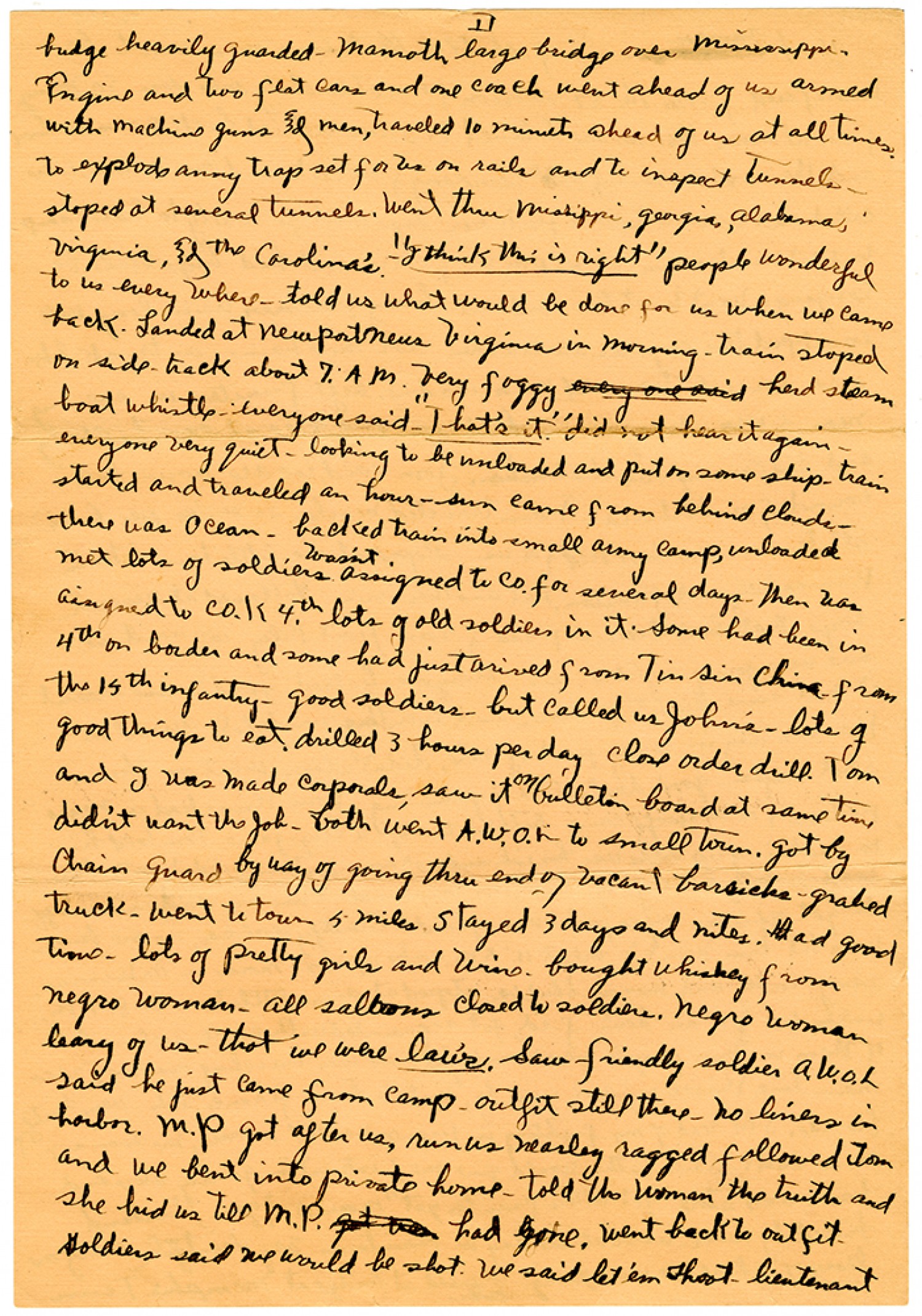 [page 2] bridge heavily guarded. Mamoth large bridge over Mississippi. Engine and two flat cars and one coach went ahead of us armed with machine guns and men, traveled 10 minutes ahead of us at all times to explode anny trap set for us on rails and to inspect tunnels - stoped at several tunnels. Went thru Mississippi, Georgia, Alabama, Virginia, and the Carolina's. "I think this is right" people wonderful to us every where - told us what would be done for us when we came back. Landed at Newport News Virginia in morning - train stoped on side-track about 7. AM. very foggy herd steam boat whistle everyone said "That's it." did not hear it again - everyone very quiet - looking to be unloaded and put on some ship. train started and traveled an hour - sun came from behind clouds - there was ocean. backed train into small army camp, unloaded met lots of soldiers wasn't assigned to co. for several days. Then was assigned to co. K 4th lots gold soldiers in it. Some had been in 4th on border and some had just arived from Tin Sin China from the 15th infantry - good soldiers - but called us John's - lots of good things to eat. drilled 3 hours per day close order drill. Tom and I was made corporals, saw it on bulletin board at same time didn't want the job - both went A.W.O.L to small town. got by Chain guard by way of going thru end of vacant barricks - grabed truck - went to town 5 miles stayed 3 days and nites. Had good time. lots of pretty girls and wine. bought whiskey from negro woman - all saloons closed to soldiers. Negro woman leary of us - that we were laws. Saw friendly soldier A.W.O.L said he just came from camp - outfit still there - no liners in harbor. M.P got after us, run us nearly ragged followed Tom and we bent into private home - told the woman the truth and she hid us till M.P. had gone. went back to outfit soldiers said we would be shot. we said let ‘em shoot - lieutenant