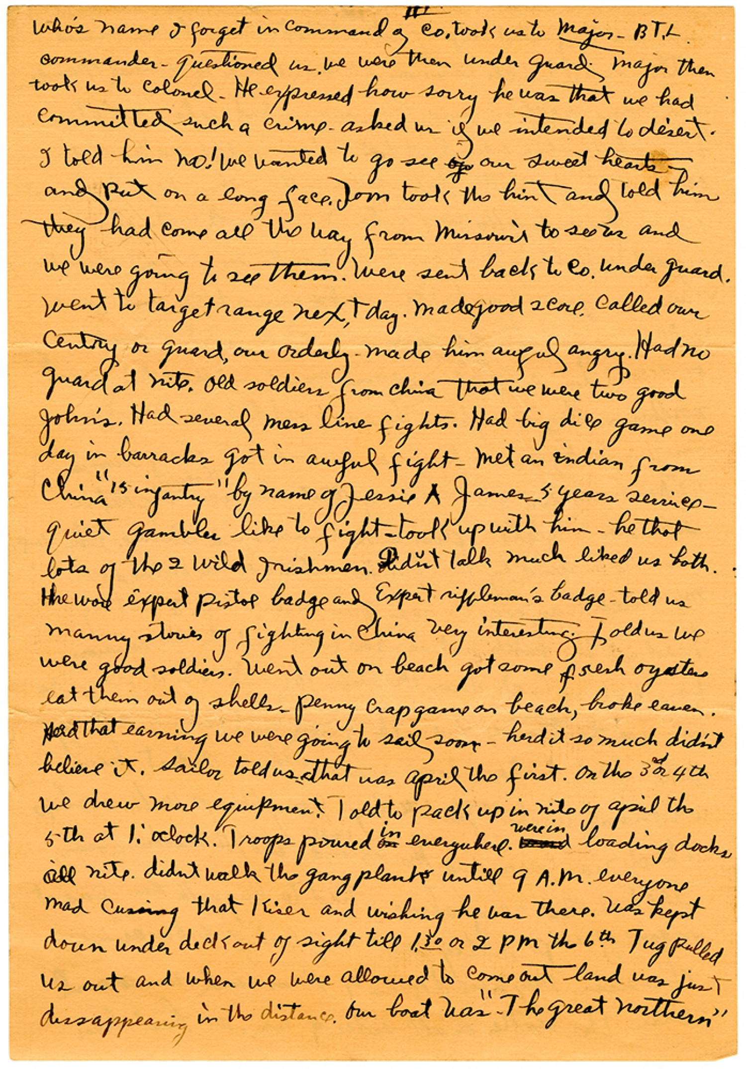 [page 3] who's name I forget in command of co. took us to major BTL commander - questioned us we were then under guard major then took us to colonel. He expressed how sorry he was that we had committed such a crime asked us if we intended to desert. I told him no! We wanted to go see our sweethearts and put on a long face. Tom took the hint and told him they had come all the way from Missouri to see us and we were going to see them. Were sent back to co. under guard. went to target range next day. made good score. called our centry or guard, our orderly - made him awful angry. Had no guard at nite. old soldiers from China thot we were two good John's. Had several mess line fights. Had big dice game one day in barracks got in awful fight. Met an Indian from China "15 infantry" by name of Jessie A James - 5 years service - quiet gambler like to fight - took up with him. he thot lots of the 2 wild Irishmen. Didn't talk much liked us both. He wore expert pistol badge and expert rifleman's badge told us manny stories of fighting in China very interesting. Told us we were good soldiers. Went out on beach got some fresh oysters eat them out of shells. penny crap game on beach, broke eaven. Had that earning we were going to sail some - herd it so much didn't believe it. sailor told us that was April the first. On the 3rd or 4th we drew more equipment. Told to pack up in nite of April the 5th at 1: oclock. Troops poured in everywhere. were in loading docks all nite. didnt walk the gang plank untill 9 A.M. everyone mad cussing that Kiser and wishing he was there. Was kept down under deck out of sight till 1.30 or 2 PM the 6th. Tug pulled us out and when we were allowed to come out land was just dissappearing in the distance. Our boat was "The Great Northern"