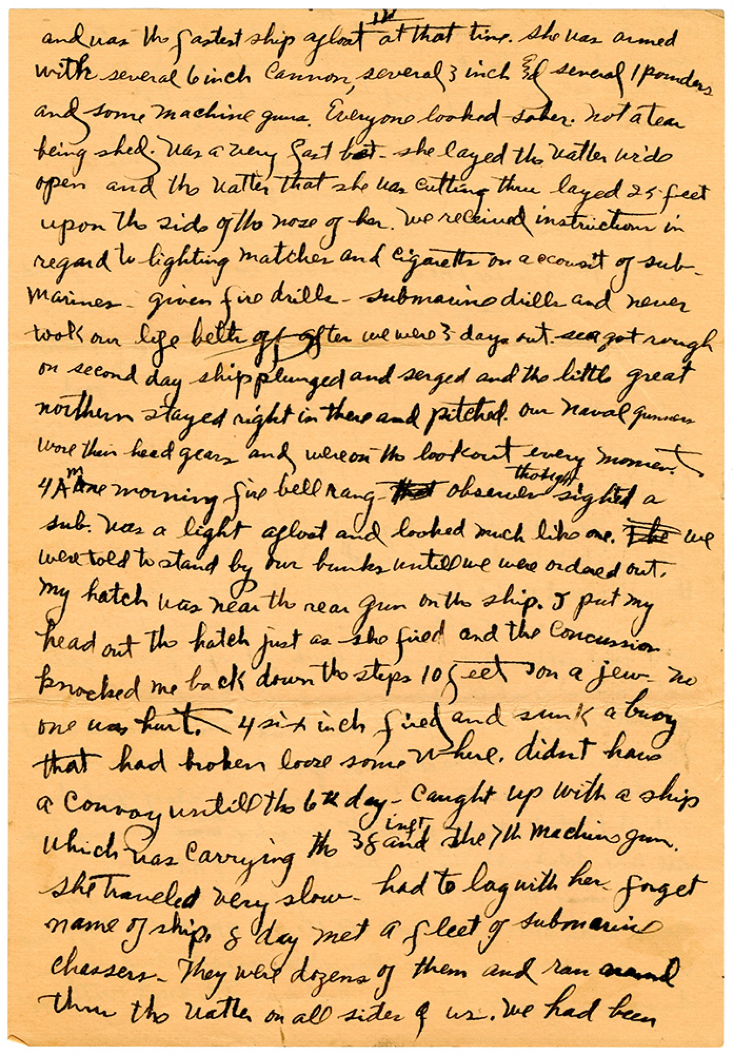 [page 4] and was the fastest ship afloat at that time. She was armed with several 6 inch cannon, several 3 inch and several 1 pounders and some machine guns. Everyone looked sober. Not a tear being shed. Was a very fast bot. she layed the watter wide open and the watter that she was cutting thru layed 25 feet upon the side of the nose of her. We received instruction in regard to lighting matches and cigaretts on account of submarines - given fire drills - submarine drills and never took our life belts off after we were 3 days out. sea got rough on second day ship plunged and serged and the little great northern stayed right in there and pitched. our navel gunners wore them head gears and were on the lookout every moment. 4 AM one morning fire bell rang. observer thought sighted a sub. was a light afloat and looked much like on. we were told to stand by our bunks untill we were ordered out. my hatch was near the rear gun on the ship. I put my head out the hatch just as she fired and the concussion knocked me back down the steps 10 feet on a jew. no one was hurt. 4 six inch fired and suck a buoy that had broken loose some where. didnt have a convoy untill the 6th day. caught up with a ship which was carrying the 38 inft and the 7th machine gun. she traveled very slow. had to lag with her. forget name of ship. 8 day met a fleet of submarine chassers. They were dozens of them and ran around thru the watter on all sides of us. we had been