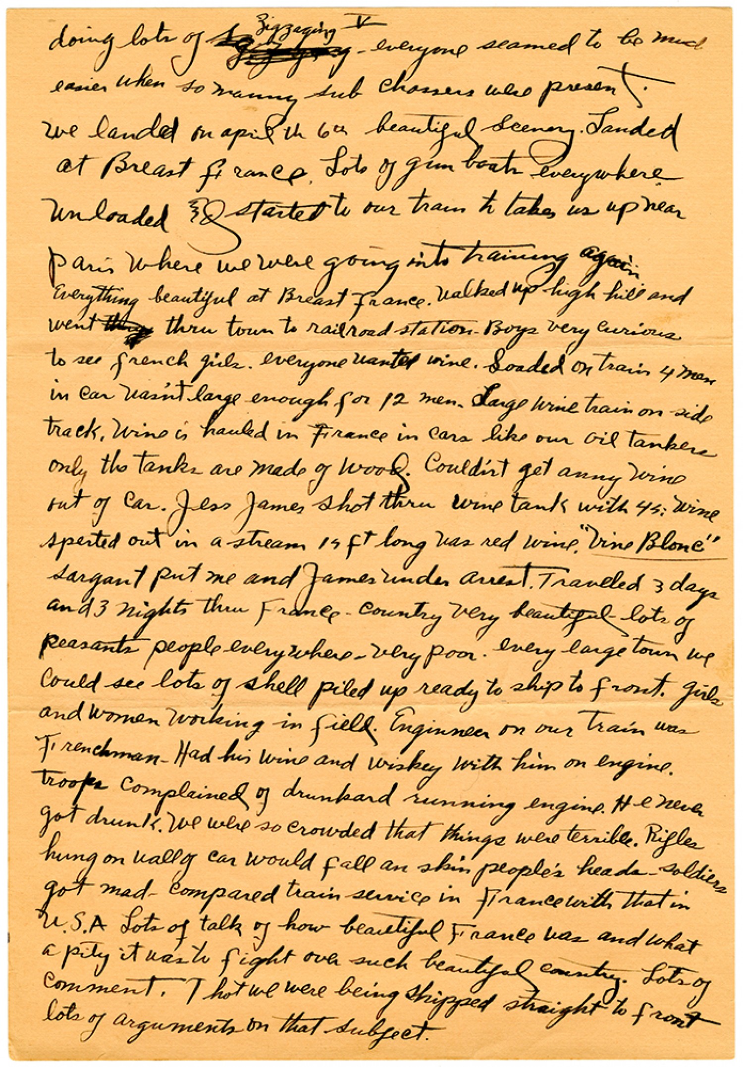 [page 5] doing lots of zigzaging - everyone seemed to be much easier when so manny sub chassers were present. we landed on April the 6th beautiful scenery. Landed at [Brest] France. Lots of gun boats everywhere unloaded and started to our train to take us up near Paris where were going into training again. Everything beautiful at [Brest] France. Walked up high hill and went thru town to railroad station. Boys very curious to see french girls. everyone wanted wine. Loaded on train 4 men in car wasn't large enough for 12 men. Large wine train on side track. wine is hauled in France in cars like our oil tankers only the tanks are made of wood. Couldn't get anny wine out of car. Jess James shot thru wine tank with 45. wine sperted out in a stream 15 ft long was red wine. "Vine Blonc" sargant put me and James under arrest. Traveled 3 days and 3 nights thru France. country very beautiful lots of peasants people everywhere - very poor. every large town we could see lots of shell piled up ready to ship to front. girls and women working in field. Engineer on our train was Frenchman. Had his wine and wiskey with him on engine. troops complained of drunkard running engine. He never got drunk. We were so crowded that things were terrible. Rifles hung on wall of car would fall an skin people's heads. soldiers got mad - compared train service in France with that in U.S.A Lots of talk of how beautiful France was and what a pity it was to fight over such beautiful country. Lots of comment. Thot we were being shipped straight to front lots of arguments on that subject.