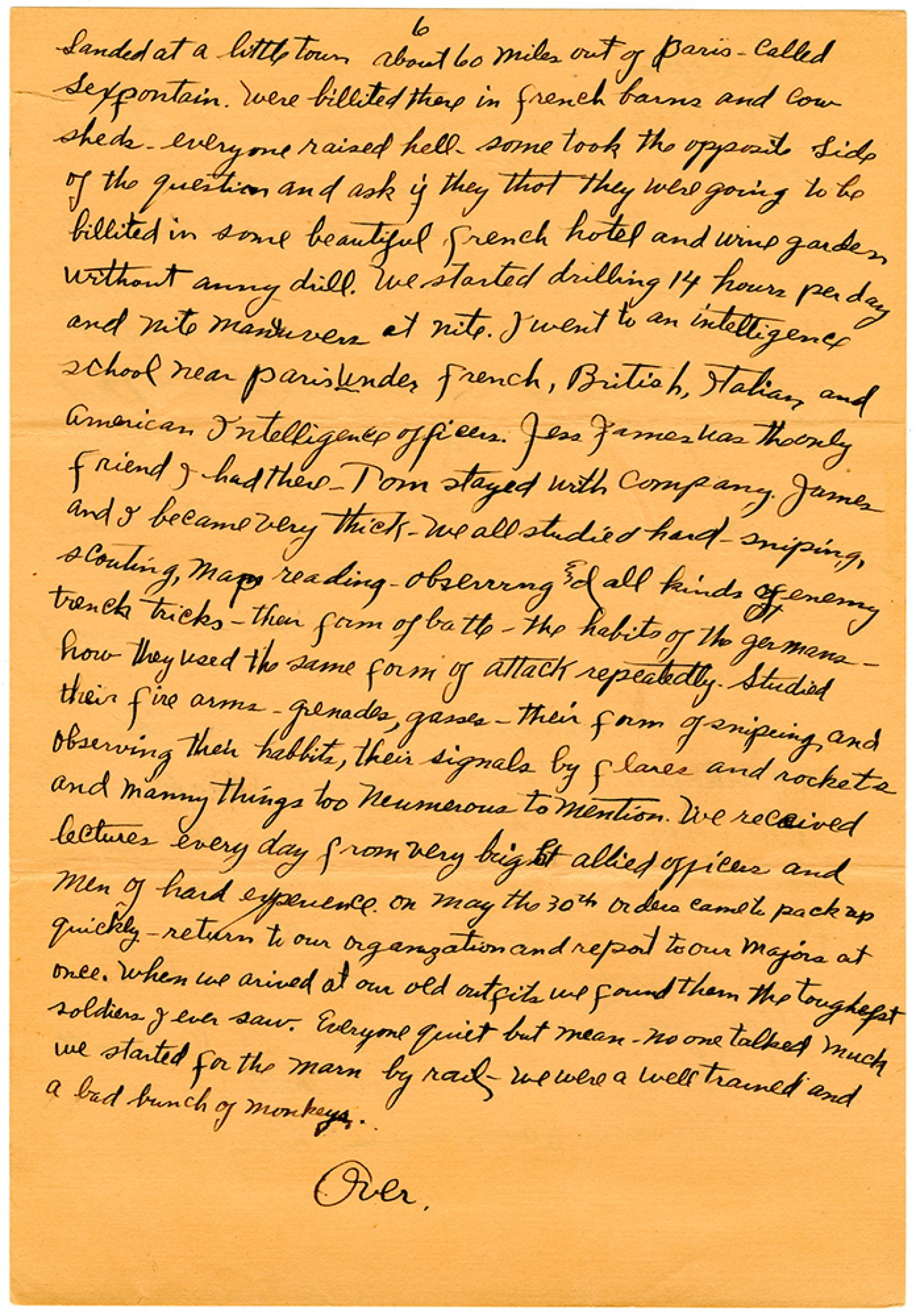 [page 6] Landed at a little town about 60 miles out of Paris - called [Sexfontaines]. were billeted there in french barns and cowsheds. everyone raised hell. some took the opposite side of the question and ask if they thot they were going to be billeted in some beautiful french hotel and wine garden without army drill. we started drilling 14 hours per day and nite maneuvers at nite. I went to an intelligence school near Paris under French, British, Italian and American Intelligence officers. Jess James was the only friend I had there. Tom stayed with company. James and I became very thick. we all studied hard - sniping, scouting, map reading - observing and all kinds of enemy trench tricks - then form of battle - the habits of the germans - how they used the same form of attack repeatedly. Studied their fire arms - grenades, gasses. Their form of snipeing and observing their habbits, their signals by flares and rockets and manny things too neumerous to mention. we received lectures every day from very bright allied officers and men of hard experience on May the 30th orders came to pack up quickly - return to our organization and report to our majors at once. When we arived at our old outfits we found them the toughest soldiers I ever saw. Everyone quiet but mean - no one talked much we started for the [Marne] by rail - we were a well trained and a bad bunch of monkeys. Over.