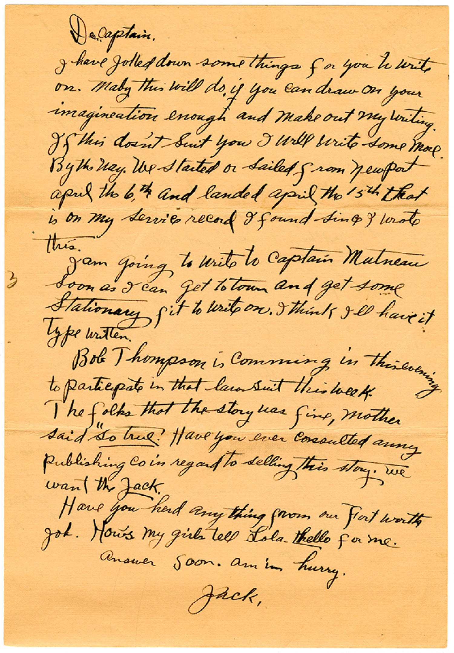 Dear Captain, I have jolled down some things for you to write on. Maby this will do if you can draw on your imagaineation enough and make out my writing. If this dosn’t Suit you I will write some more. By the way. We started or Sailed from Newport April the 6th and landed April the 15th that is on my Service record I found since I wrote this. I am going to write to Captain Mutneau Soon as I can get to town and get some Stationary fit to write on. I think Ill have it type written. Bob Thompson is comming in this evening to participate in that lawsuit this week. The folks that the story was fine, mother said "so true. Have you ever consulted anny publishing co in regard to selling this story. we want the Jack. Have you herd any thing from our Fort Worth job. How's my girls tell Lola hello for me Answer soon. am in hurry. Jack.