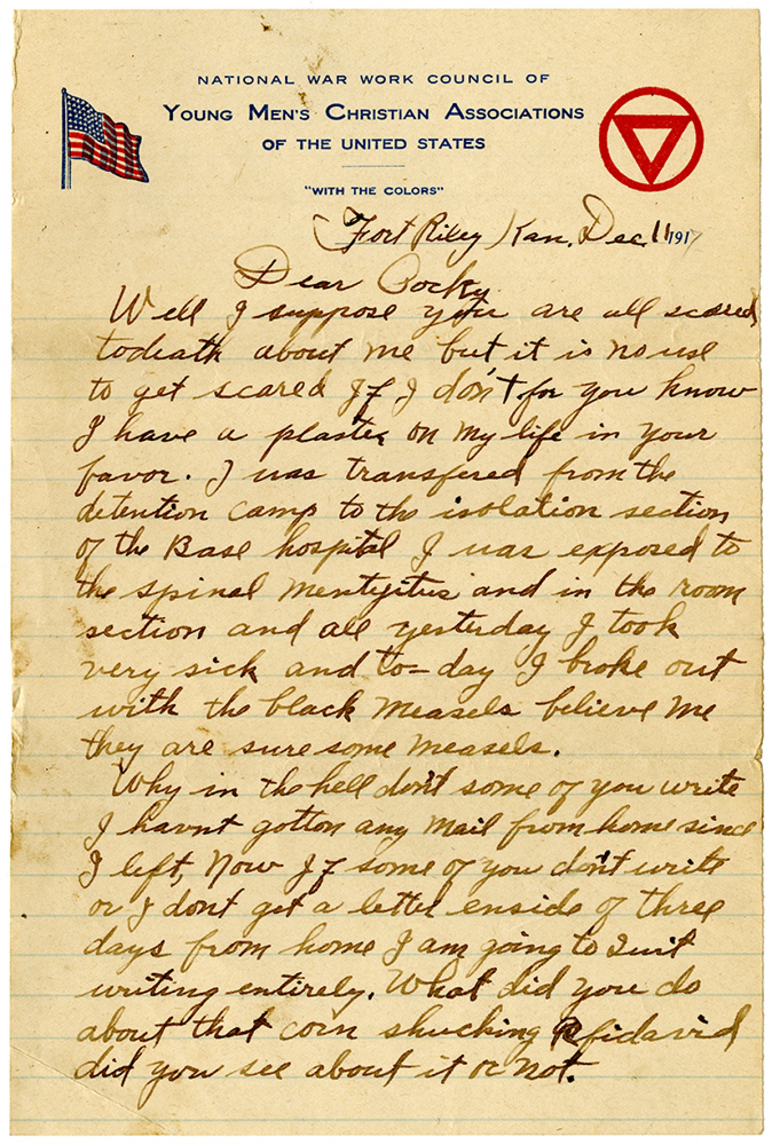 Fort Riley [Kansas] [December] 11 1917 Dear Cocky Well I suppose you are all scared to death about me but it is no use to get scared If I don't for you know I have a plaster on my life in your favor. I was transfered from the detention camp to the isolation section of the Base hospital I was exposed to the spinal mentigitus and in the room section and all yesterday I took very sick and to-day I broke out with the black measels believe me they are sure some measels. Why in the hell don't some of you write I havent gotton any mail from home since I left, Now If some of your don't write or I dont get a letter enside of three days from home I am going to Quit writing entirely. What did you do about the corn shucking afidvid did you see about it or not.