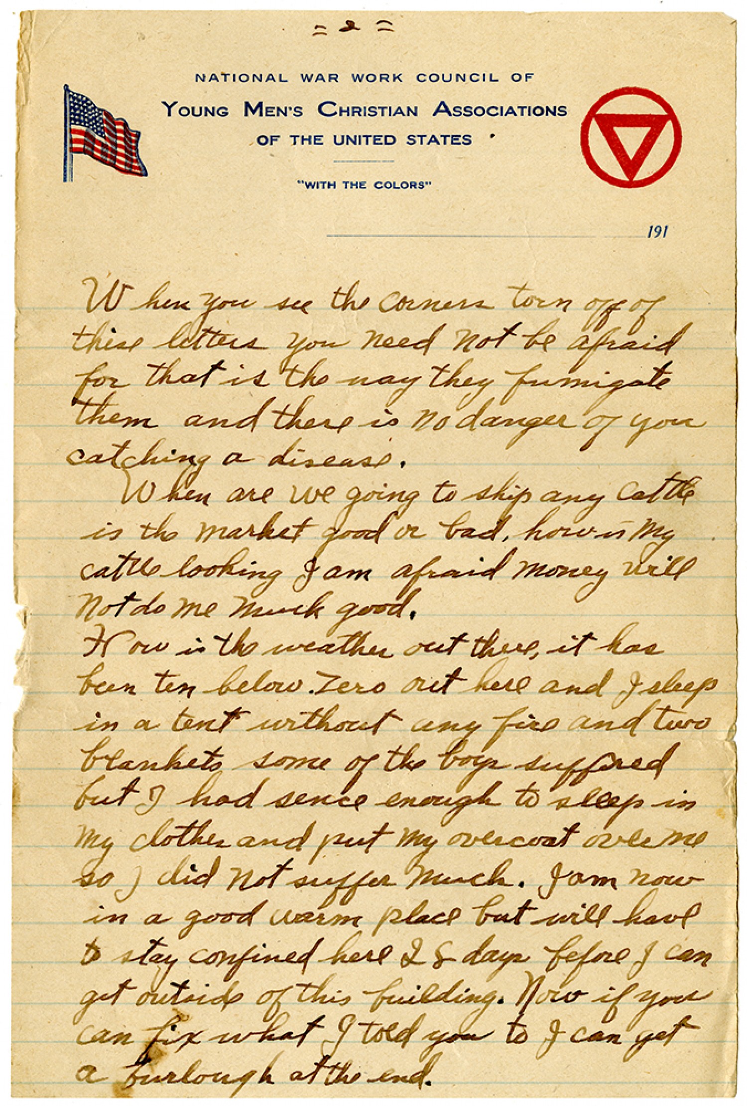 [page 2] When you see the corners torn off of these letters you need not be afraid for that is the way they fumigate them and there is no danger of you catching a disease. When are we going to ship any cattle is the market good or bad. how is my cattle looking I am afriad money will not do me much good. How is the weather out there, it has been ten below zero out here and I sleep in a tent without any fire and two blankets some of the boys suffered but I had sence enough to sleep in my clothes and put my overcoat over me so I did not suffer much. I am now in a good warm place but will have to stay confined here 28 days before I can get outside of this building. Now if you can fix what I told you to I can get a furlough at the end.