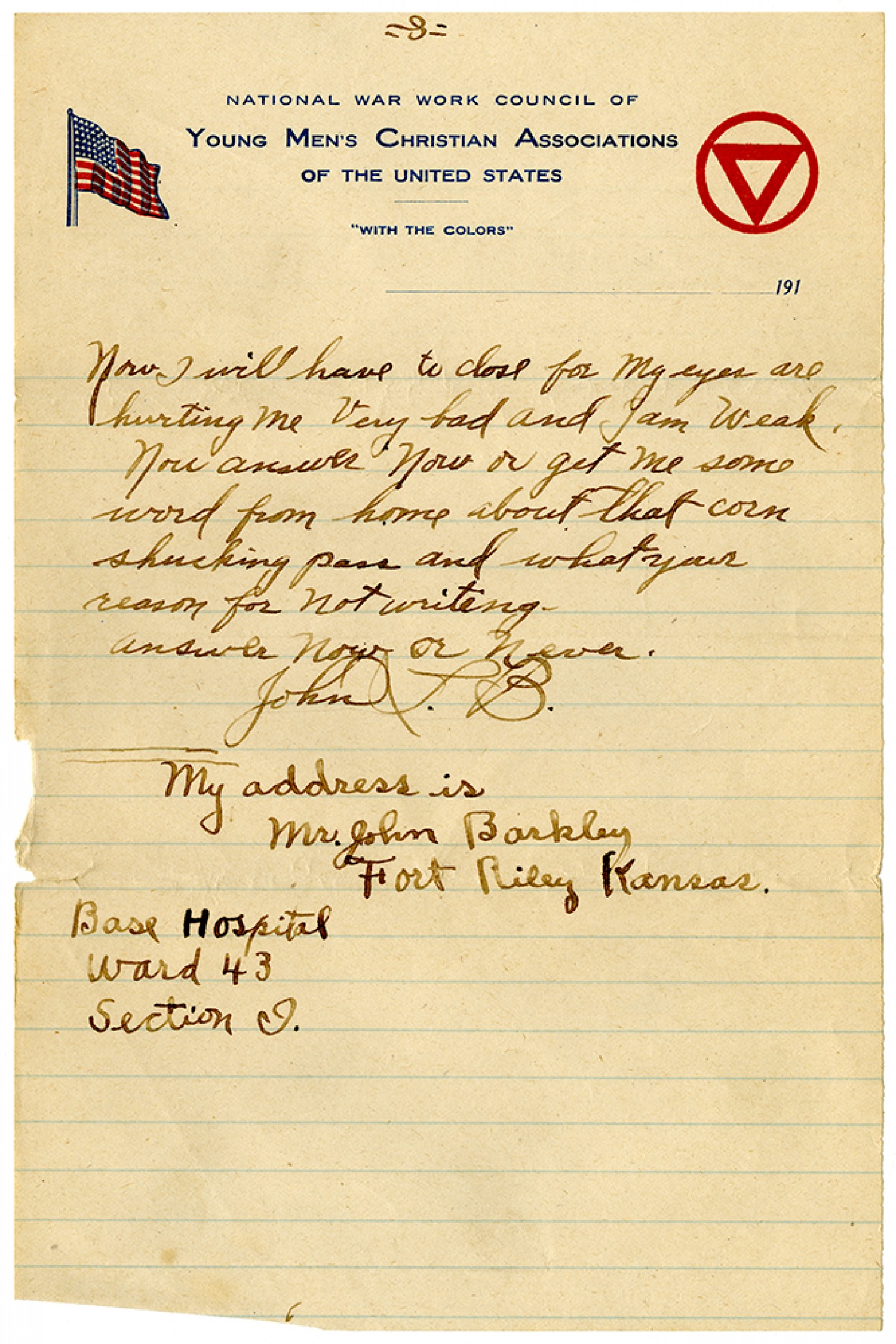 [page 3] Now I will have to close for my eyes are hurting me very bad and I am weak. Now answer now or get me some word from home about that corn shucking pass and what your reason for not writing. answer now or never. John L. B. My address is Mr. John Barkley Fort Riley Kansas Base Hospital Ward 43 Section I.