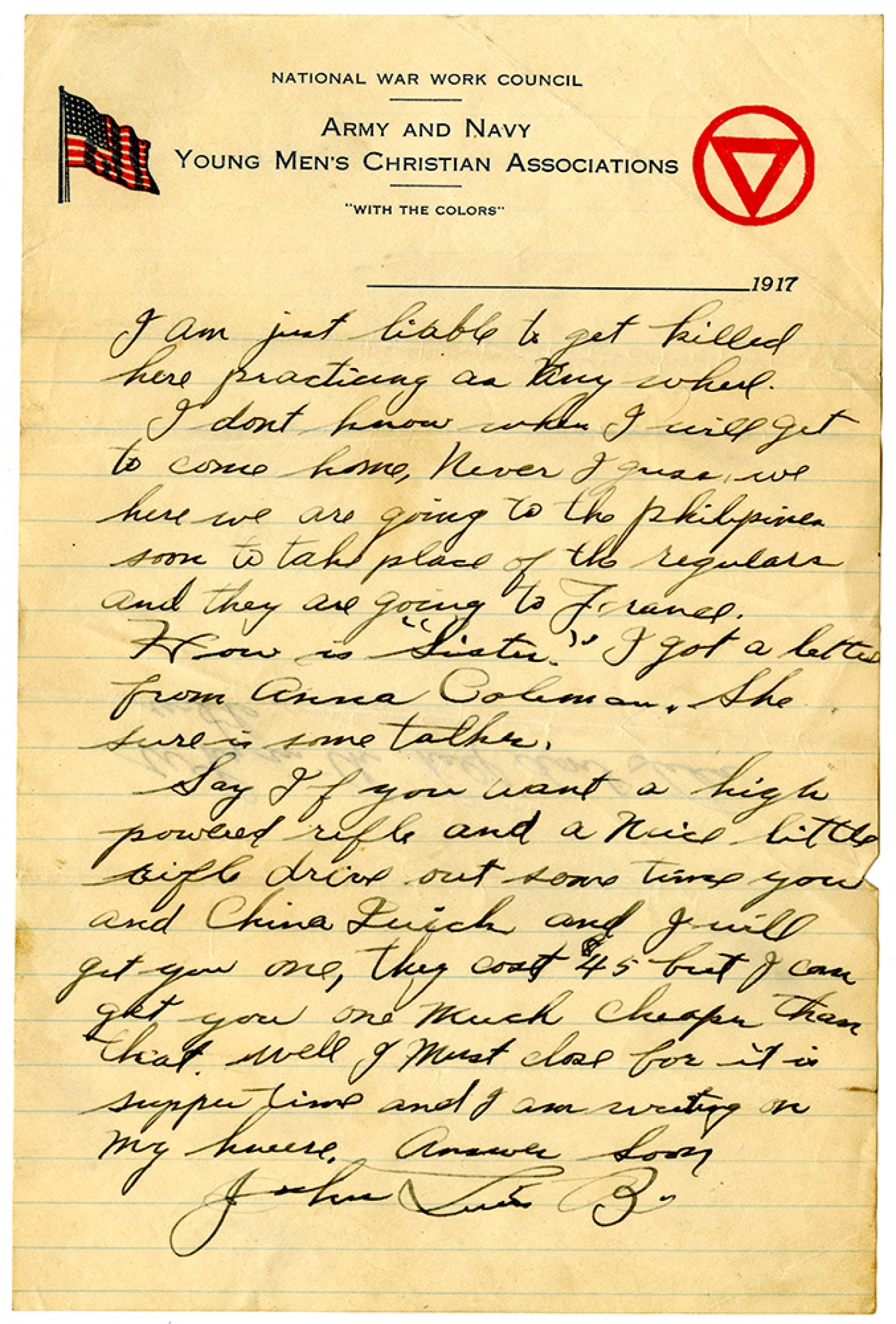 I am just liable to get killed here practicing as any where. I dont know when I will get to come home, never I guss. we here we are going to the [Philippines] soon to take place of the regulars and they are going to France. How is "Sister." I got a letter from Anna Coleman. She sure is some talker. Say If you want a high powered rifle and a nice little rifle drive out some time you and China Quick and I will get your one, they cost $45 but I can get you one much cheaper than that. well I must close for it is supper time and I am writing on my kneese. Answer Soon John Lewis B.