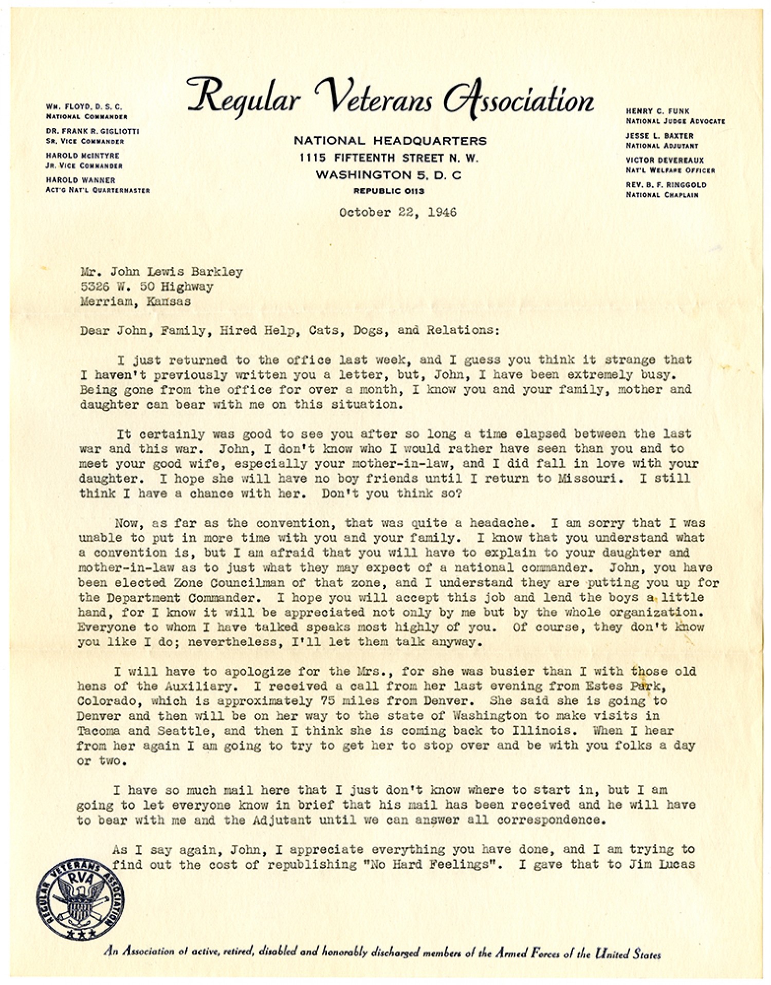 October 22, 1946 Mr. John Lewis Barkley 5366 W. 50 Highway Merriam, Kansas Dear John, Family, Hired Help, Cats, Dogs, and Relations: I just returned to the office last week, and I guess you think it strange that I haven't previously written you a letter, but, John, I have been extremely busy. Being gone from the office for over a month, I know you and your family, mother and daughter can bear with me on this situation. It certainly was good to see you after so long a time elapsed between the last war and this war. John, I don't know who I would rather have seen than you and to meet your good wife, especially your mother-in-law, and I did fall in love with your daughter. I hope she will have no boy friends until I return to Missouri. I still think I have a chance with her. Don't you think so? Now, as far as the convention, that was quite a headache. I am sorry that I was unable to put in more time with you and your family. I know that you understand what a convention is, but I am afraid that you will have to explain to you daughter and mother-in-law as to just what they may expect of a national commander. John, you have been elected Zone Councilman of that zone, and I understand they are putting you up for the Department Commander. I hope you will accept this job and lend the boys a little hand, for I know it will be appreciated not only by me but by the whole organization. Everyone to whom I have talked speaks most highly of you. Of course, they don't know you like I do; nevertheless, I'll let them talk anyway. I will have to apologize for the Mrs., for she was busier than I with those old hens of the Auxiliary. I received a call from her last evening from Estes Park, Colorado, which is approximately 75 miles from Denver. She said she is going to Denver and then will be on her way to the state of Washington to make visits in Tacoma and Seattle, and then I think she is coming back to Illinois. When I hear from her again I am going to try to get her to stop over and be with you folks a day or two. I have so much mail here that I just don't know where to start in, but I am going to let everyone know in brief that his mail has been received and he will have to bear with me and the Adjutant until we can answer all correspondence. As I say again, John, I appreciate everyone you have done, and I am trying to find out the cost of republishing "No Hard Feelings". I gave that to Jim Lucas
